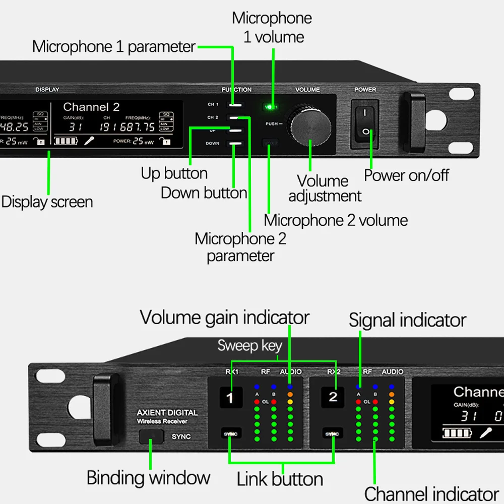 1. Используя диапазон частот UHF512-562Mhz/645-695 МГц/925-937 МГц, два канала принимают сигналы независимо. Каждый канал имеет 100 дополнительных каналов, чтобы избежать частоты помех.