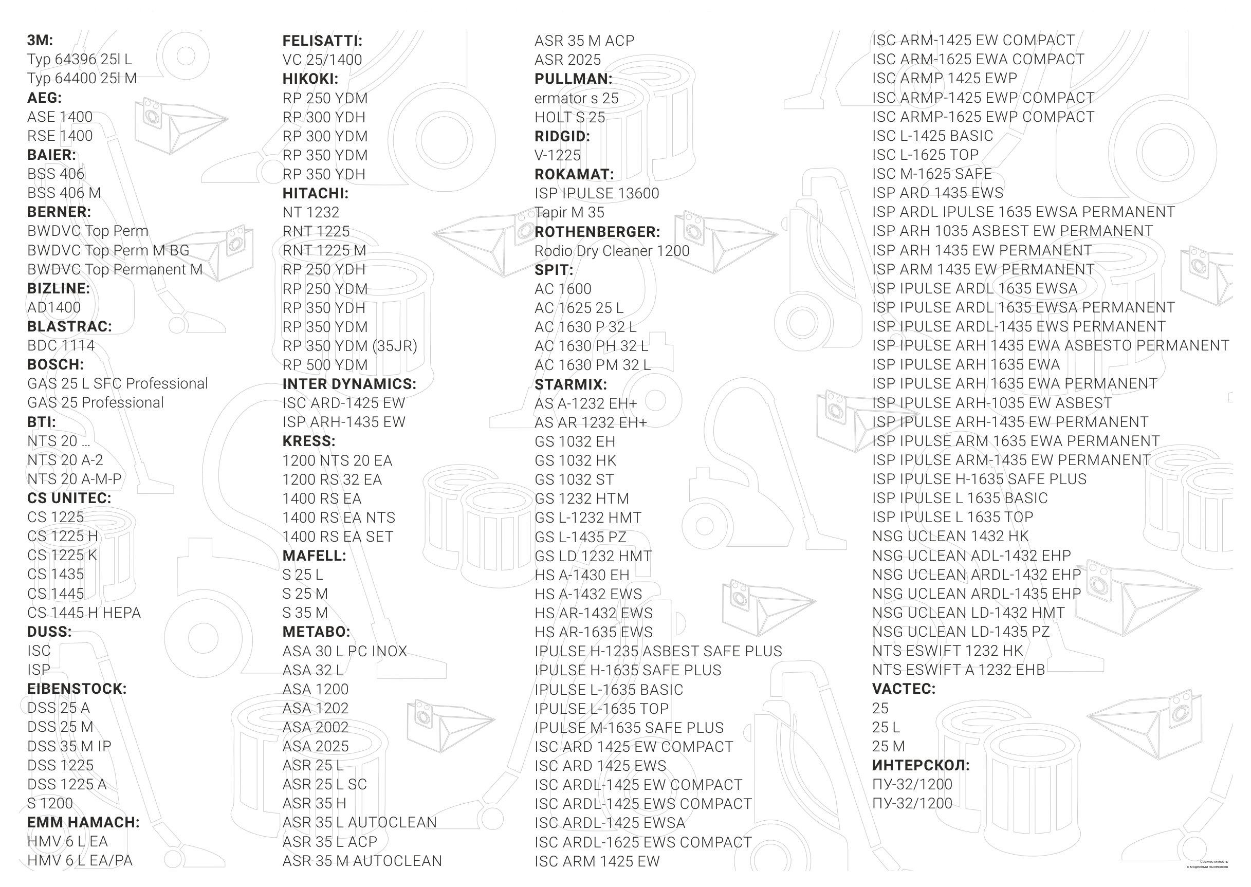 3M: 3M Typ 64396 25l L, 3M Typ 64400 25l M, AEG: AEG ASE 1400, AEG RSE 1400, BAIER: BAIER BSS 406, BAIER BSS 406 M, BERNER: BERNER BWDVC Top Perm, BERNER BWDVC Top Perm M BG, BERNER BWDVC Top Permanent M, BIZLINE: BIZLINE AD1400, BLASTRAC: BLASTRAC BDC 1114, BOSCH: BOSCH GAS 25 L SFC Professional, BOSCH GAS 25 Professional, BTI: BTI NTS 20 …, BTI NTS 20 A-2, BTI NTS 20 A-M-P, CS UNITEC: CS UNITEC CS 1225, CS UNITEC CS 1225 H, CS UNITEC CS 1225 K, CS UNITEC CS 1435, CS UNITEC CS 1445, CS UNITEC CS 1445 H HEPA, DUSS: DUSS ISC, DUSS ISP, EIBENSTOCK: EIBENSTOCK DSS 25 A, EIBENSTOCK DSS 25 M, EIBENSTOCK DSS 35 M IP, EIBENSTOCK DSS 1225, EIBENSTOCK DSS 1225 A, EIBENSTOCK SS 1200, EMM HAMACH: EMM HAMACH HMV 6 L EA, EMM HAMACH HMV 6 L EA/PA, FELISATTI: FELISATTI VC 25/1400, HIKOKI: HIKOKI RP 250 YDM, HIKOKI RP 300 YDH, HIKOKI RP 300 YDM, HIKOKI RP 350 YDM, HIKOKI RP 350 YDH, HITACHI: HITACHI NT 1232, HITACHI RNT 1225, HITACHI RNT 1225 M, HITACHI RP 250 YDH, HITACHI RP 250 YDM, HITACHI RP 350 YDH, HITACHI RP 350 YDM, HITACHI RP 350 YDM (35JR), HITACHI RP 500 YDM, INTER DYNAMICS: INTER DYNAMICS ISC ARD-1425 EW, INTER DYNAMICS ISP ARH-1435 EW, KRESS: KRESS 1200 NTS 20 EA, KRESS 1200 RS 32 EA, KRESS 1400 RS EA, KRESS 1400 RS EA NTS, KRESS 1400 RS EA SET, MAFELL: MAFELL S 25 L, MAFELL S 25 M, MAFELL S 35 M, METABO: METABO ASA 32 L, METABO ASA 1200, METABO ASA 1202, METABO ASA 2002, METABO ASA 2025, METABO ASR 25 L, METABO ASR 25 L SC, METABO ASR 35 H, METABO ASR 35 L AUTOCLEAN, METABO ASR 35 L ACP, METABO ASR 35 M AUTOCLEAN , METABO ASR 35 M ACP, METABO ASR 2025, PULLMAN: PULLMAN ermator s 25, PULLMAN HOLT S 25, RIDGID: RIDGID V-1225, ROKAMAT: ROKAMAT ISP IPULSE 13600, ROKAMAT Tapir M 35, ROTHENBERGER: ROTHENBERGER Rodio Dry Cleaner 1200, SPIT: SPIT AC 1600, SPIT AC 1625 25 L, SPIT AC 1630 P 32 L, SPIT AC 1630 PH 32 L, SPIT AC 1630 PM 32 L, STARMIX: STARMIX AS A-1232 EH+, STARMIX AS AR 1232 EH+, STARMIX GS 1032 EH, STARMIX GS 1032 HK, STARMIX GS 1032 ST, STARMIX GS 1232 HTM, STARMIX GS L-1232 HMT, STARMIX GS L-1435 PZ, STARMIX GS LD 1232 HMT, STARMIX HS A-1430 EH, STARMIX HS A-1432 EWS, STARMIX HS AR-1432 EWS, STARMIX HS AR-1635 EWS, STARMIX IPULSE H-1235 ASBEST SAFE PLUS, STARMIX IPULSE H-1635 SAFE PLUS, STARMIX IPULSE L-1635 BASIC, STARMIX IPULSE L-1635 TOP, STARMIX IPULSE M-1635 SAFE PLUS, STARMIX ISC ARD 1425 EW COMPACT, STARMIX ISC ARD 1425 EWS, STARMIX ISC ARDL-1425 EW COMPACT, STARMIX ISC ARDL-1425 EWS COMPACT, STARMIX ISC ARDL-1425 EWSA, STARMIX ISC ARDL-1625 EWS COMPACT, STARMIX ISC ARM 1425 EW, STARMIX ISC ARM-1425 EW COMPACT, STARMIX ISC ARM-1625 EWA COMPACT, STARMIX ISC ARMP 1425 EWP, STARMIX ISC ARMP-1425 EWP COMPACT, STARMIX ISC ARMP-1625 EWP COMPACT, STARMIX ISC L-1425 BASIC, STARMIX ISC L-1625 TOP, STARMIX ISC M-1625 SAFE, STARMIX ISP ARD 1435 EWS, STARMIX ISP ARDL IPULSE 1635 EWSA PERMANENT, STARMIX ISP ARH 1035 ASBEST EW PERMANENT, STARMIX ISP ARH 1435 EW PERMANENT, STARMIX ISP ARM 1435 EW PERMANENT, STARMIX ISP IPULSE ARDL 1635 EWSA, STARMIX ISP IPULSE ARDL 1635 EWSA PERMANENT, STARMIX ISP IPULSE ARDL-1435 EWS PERMANENT, STARMIX ISP IPULSE ARH 1435 EWA ASBESTO PERMANENT, STARMIX ISP IPULSE ARH 1635 EWA, STARMIX ISP IPULSE ARH 1635 EWA PERMANENT, STARMIX ISP IPULSE ARH-1035 EW ASBEST, STARMIX ISP IPULSE ARH-1435 EW PERMANENT, STARMIX ISP IPULSE ARM 1635 EWA PERMANENT, STARMIX ISP IPULSE ARM-1435 EW PERMANENT, STARMIX ISP IPULSE H-1635 SAFE PLUS, STARMIX ISP IPULSE L 1635 BASIC, STARMIX ISP IPULSE L 1635 TOP, STARMIX NSG UCLEAN 1432 HK, STARMIX NSG UCLEAN ADL-1432 EHP, STARMIX NSG UCLEAN ARDL-1432 EHP, STARMIX NSG UCLEAN ARDL-1435 EHP, STARMIX NSG UCLEAN LD-1432 HMT, STARMIX NSG UCLEAN LD-1435 PZ, STARMIX NTS ESWIFT 1232 HK, STARMIX NTS ESWIFT A 1232 EHB, VACTEC: VACTEC 25, VACTEC 25 L, VACTEC 25 M, ИНТЕРСКОЛ: ИНТЕРСКОЛ ПУ-30/1400, ИНТЕРСКОЛ ПУ-32/1200