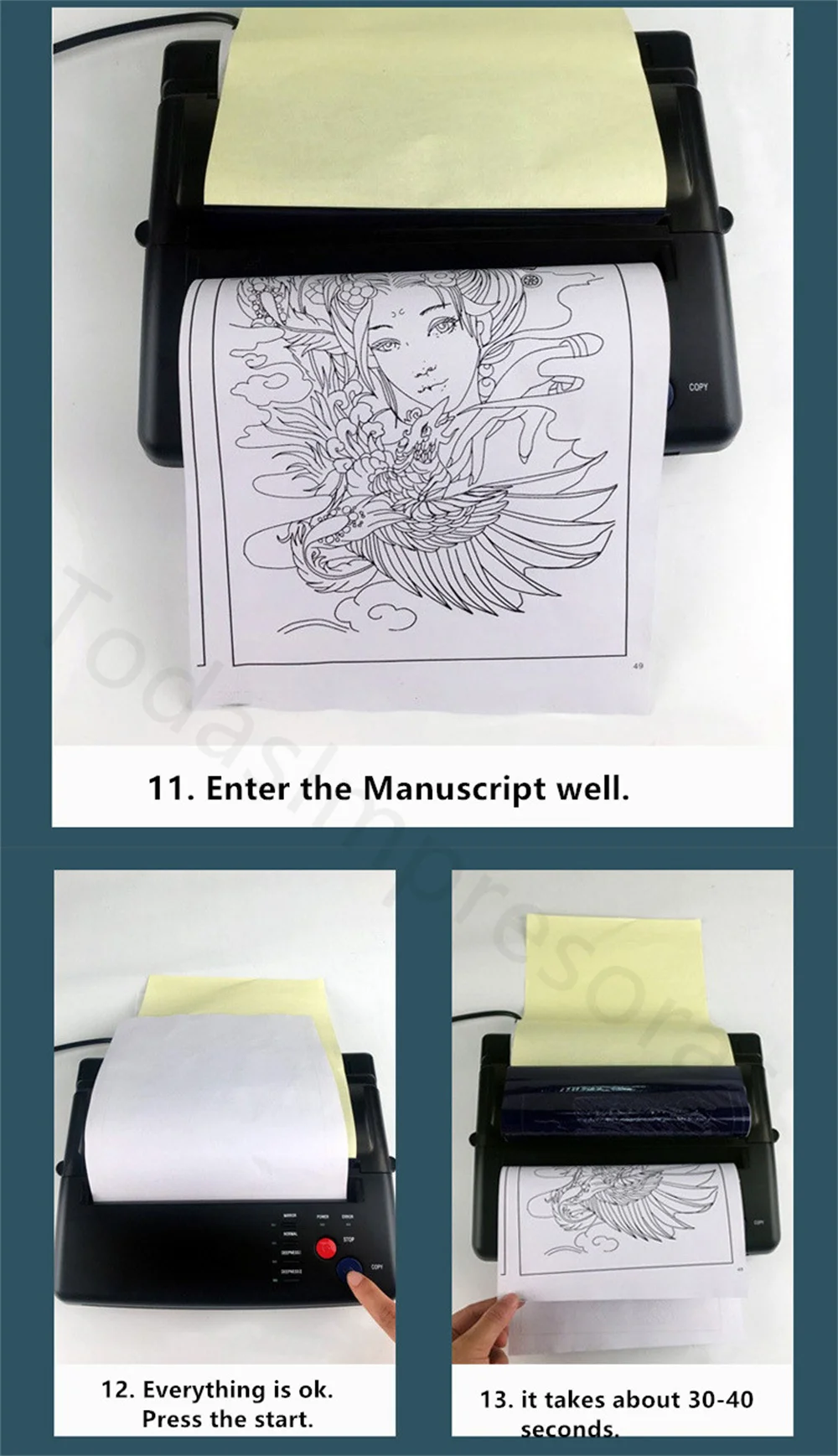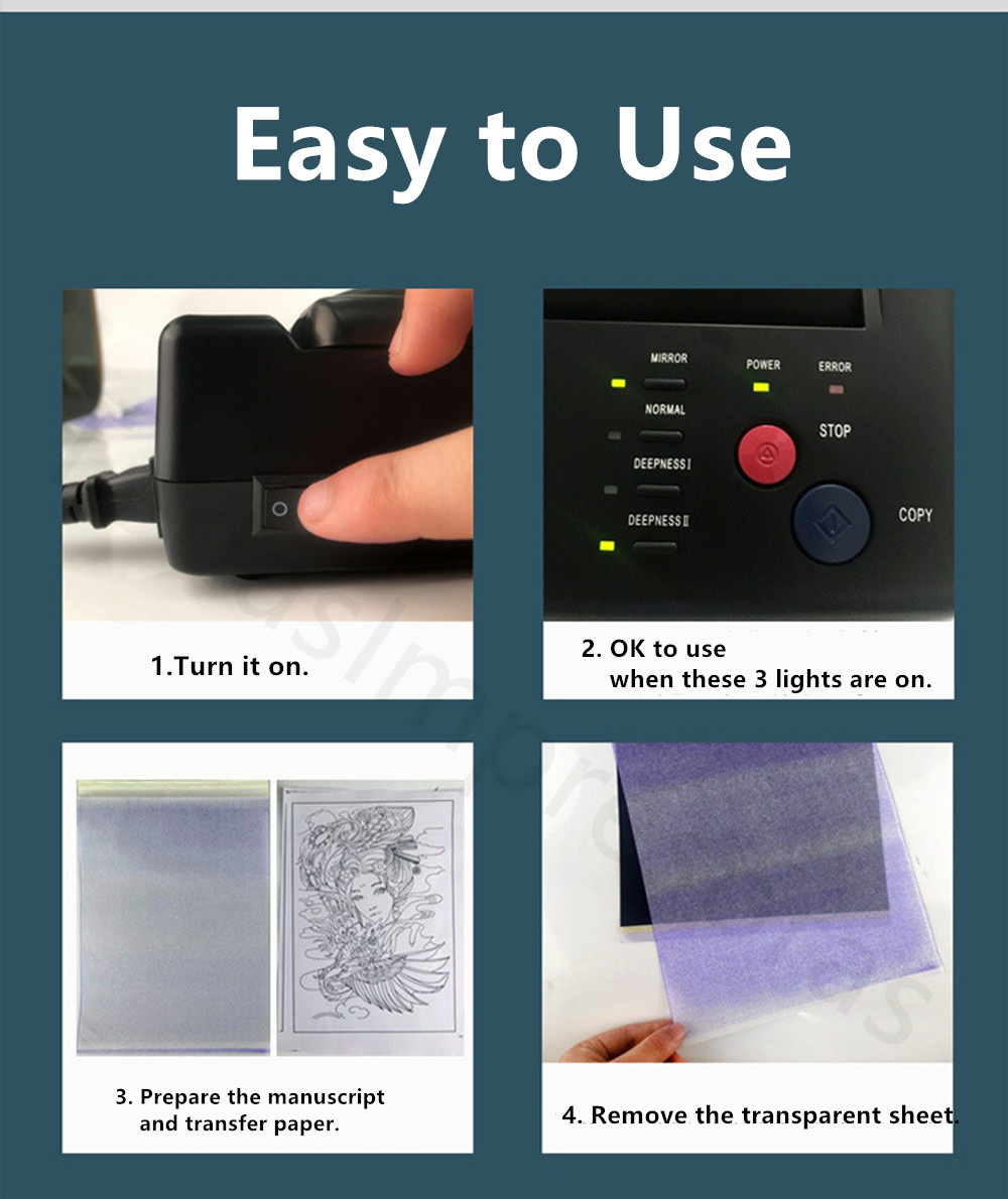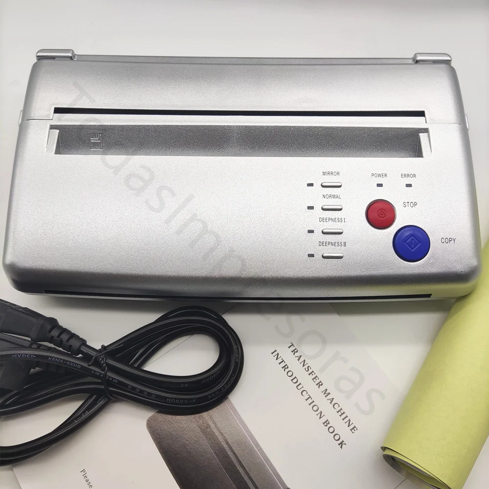 Термокопировальный аппарат позволяет татуировщику сделать копию дизайна, который затем может быть перенесен на кожу человека, получающего татуировку, убедившись, что татуировщик получит именно то, что он или она хочет