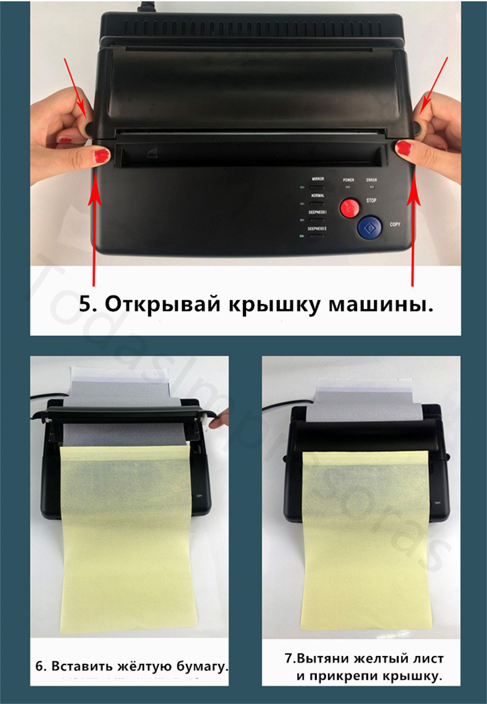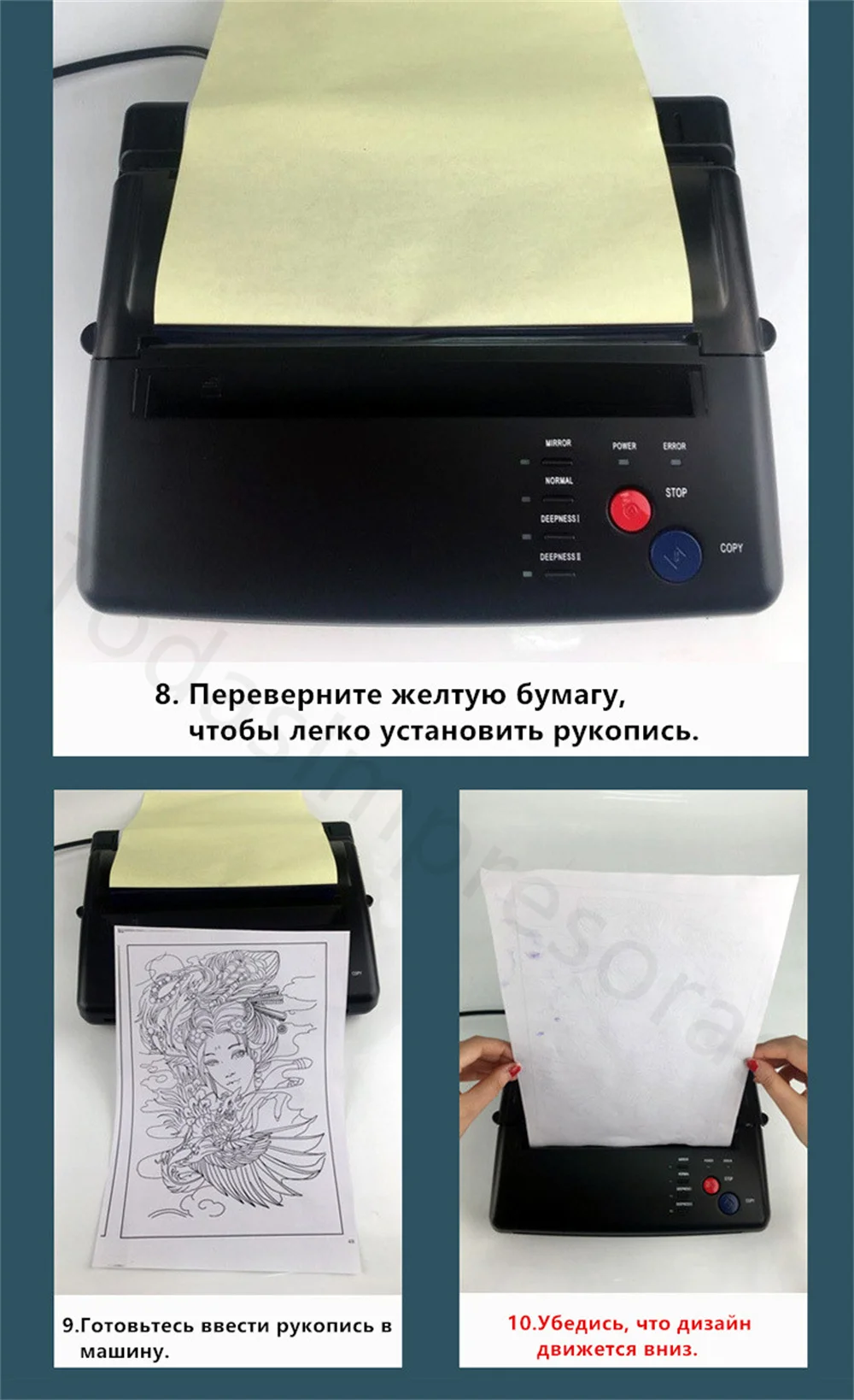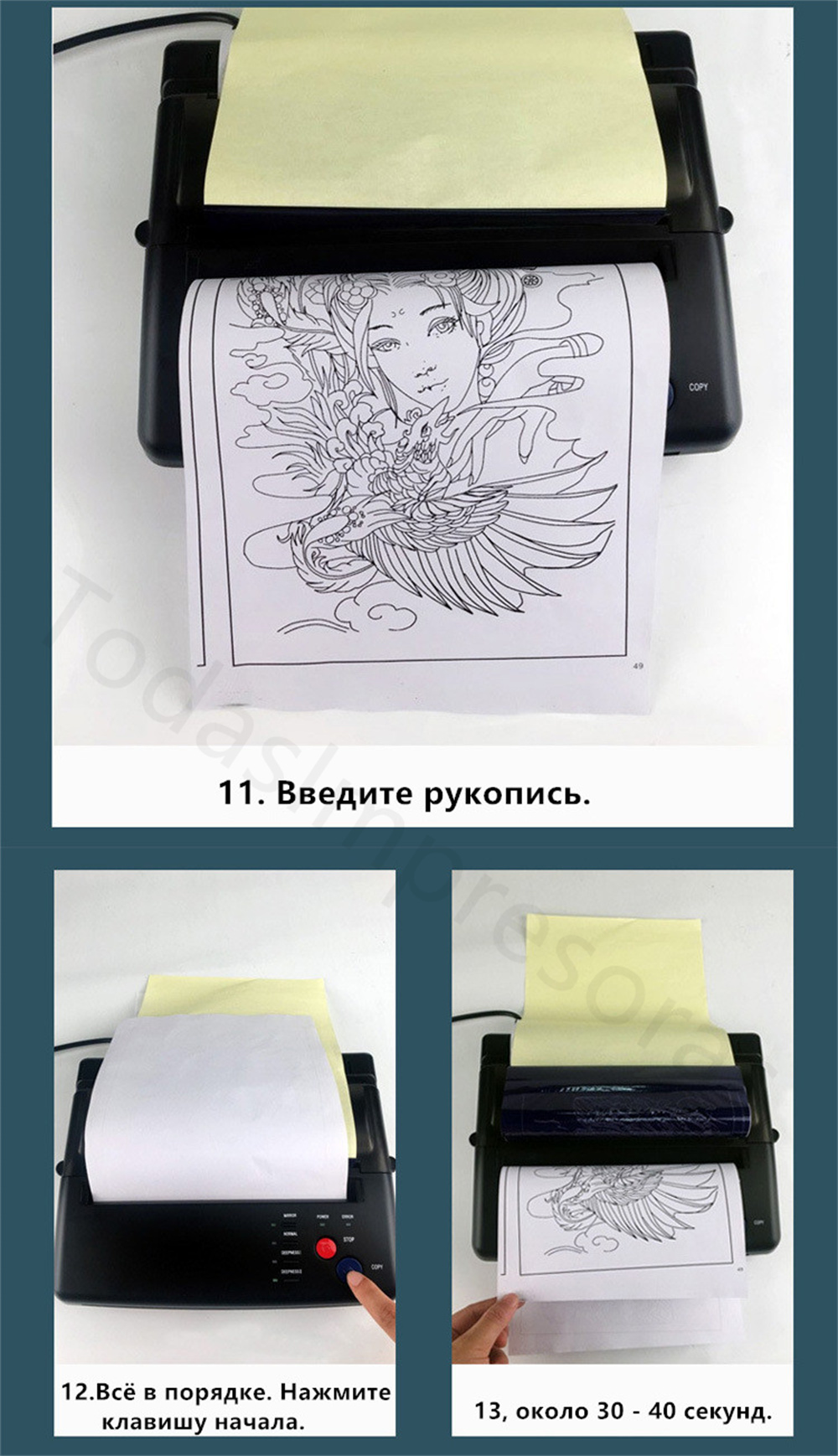 Термокопировальный аппарат позволяет татуировщику сделать копию дизайна, который затем может быть перенесен на кожу человека, получающего татуировку, убедившись, что татуировщик получит именно то, что он или она хочет