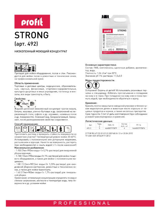 Описание: Профессиональный низкопенный обезжиривающий концентрат для устранения сильных загрязнений, уборки промышленных объектов и ремонтных зон PROFIT STRONG, канистра 5л - это оригинальное сертифицированное моющее средство от производителя. Жидкий щелочной низкопенный концентрат против мазута, битума, жировых, улично-бытовых и др. загрязнений на нержавеющей стали, кафеле, керамике, наливных полах и др. поверхностях. Чистящее средство освежает внешний вид поверхности. Моющее средство применяется в торговых и деловых центрах, медицинских, образовательных спортивно-оздоровительных, культурно-досуговых и иных учреждениях, гостиницах, вокзалах, всех видах транспорта, а также в быту. Средство для мытья полов применимо для уборки как машинным, так и ручным способом. Способ применения: использовать с поломоечными или роторными машинами, распылением и вручную. Приготовить раствор. Температурный режим мойки 20-60°С. Нанести на поверхность, растереть (при необходимости) и смыть водой (<1ч после нанесения!) Максимальное разбавление: 1/150 (0,7%-раствор) для ежедневной уборки вручную; 1/100 (1%-раствор) для мойки пищевого оборудования, а также для мойки с поломоечными машинами; 1/80 (1,25%-раствор) для ежедневной уборки в мастерских, ремонтных и технических зонах, а также для мойки транспорта; 1/60 (1,7%-раствор) для генеральной уборки. Примечание: оптимальную концентрацию определять по виду и степени загрязнения, жёсткости и температуре воды, типу поверхности и др. условиям мойки.