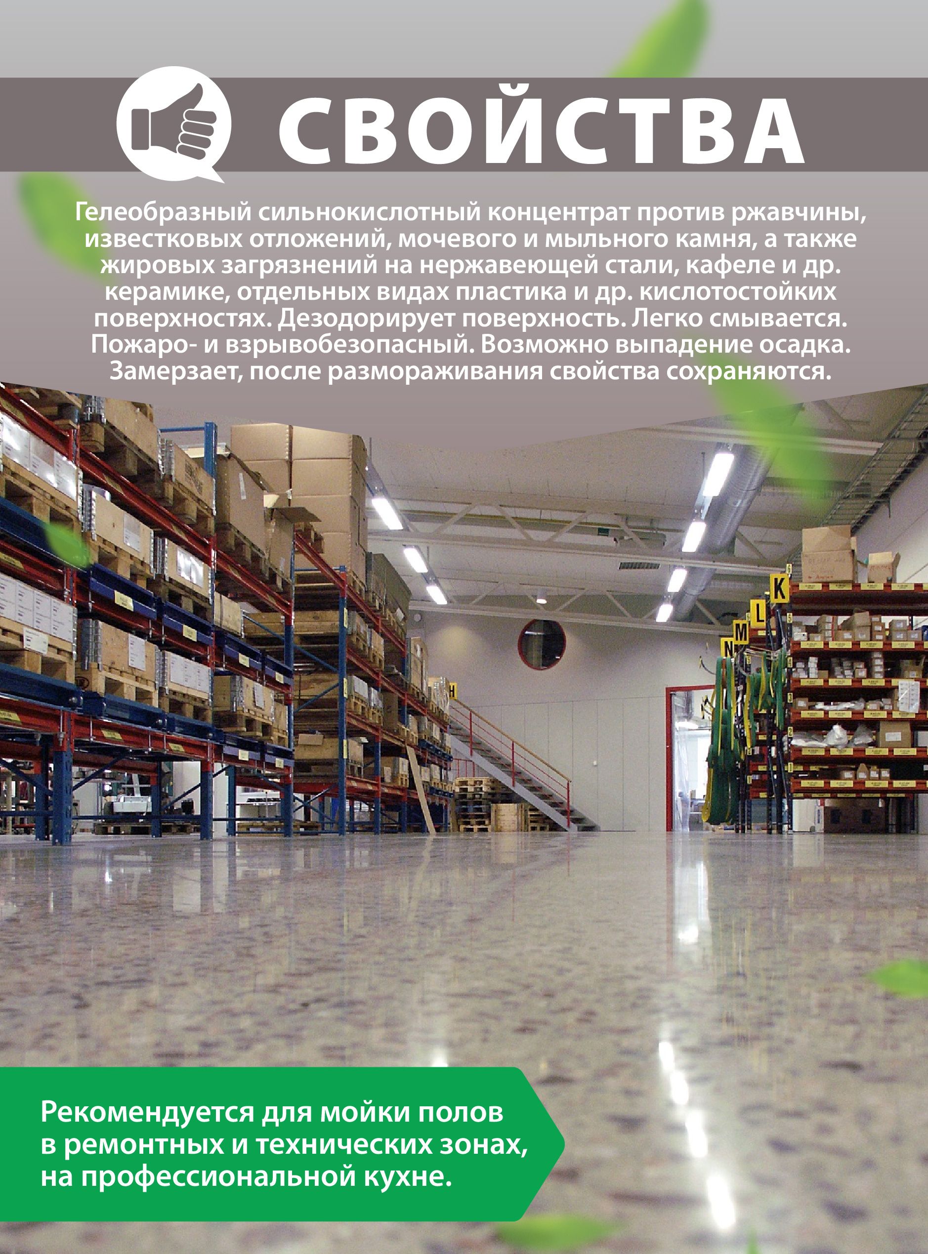 Особенности применения: Антибактериальный эффект, Концентрат, Не требует смывания водой, Эффективен в холодной воде, Антицемент