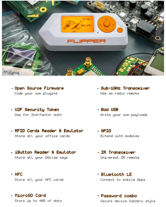 Flipper Zero-портативный многофункциональный инструмент, который объединяет различные протоколы IoT (Sub-1 GHz, NFC, инфракрасный, RFID, Bluetooth и т. Д.) В одно устройство. Он может быть запрограммирован и поддерживает карты microSD, USB-соединения и контакты GPIO, что позволяет расширять так, как вам нравится.