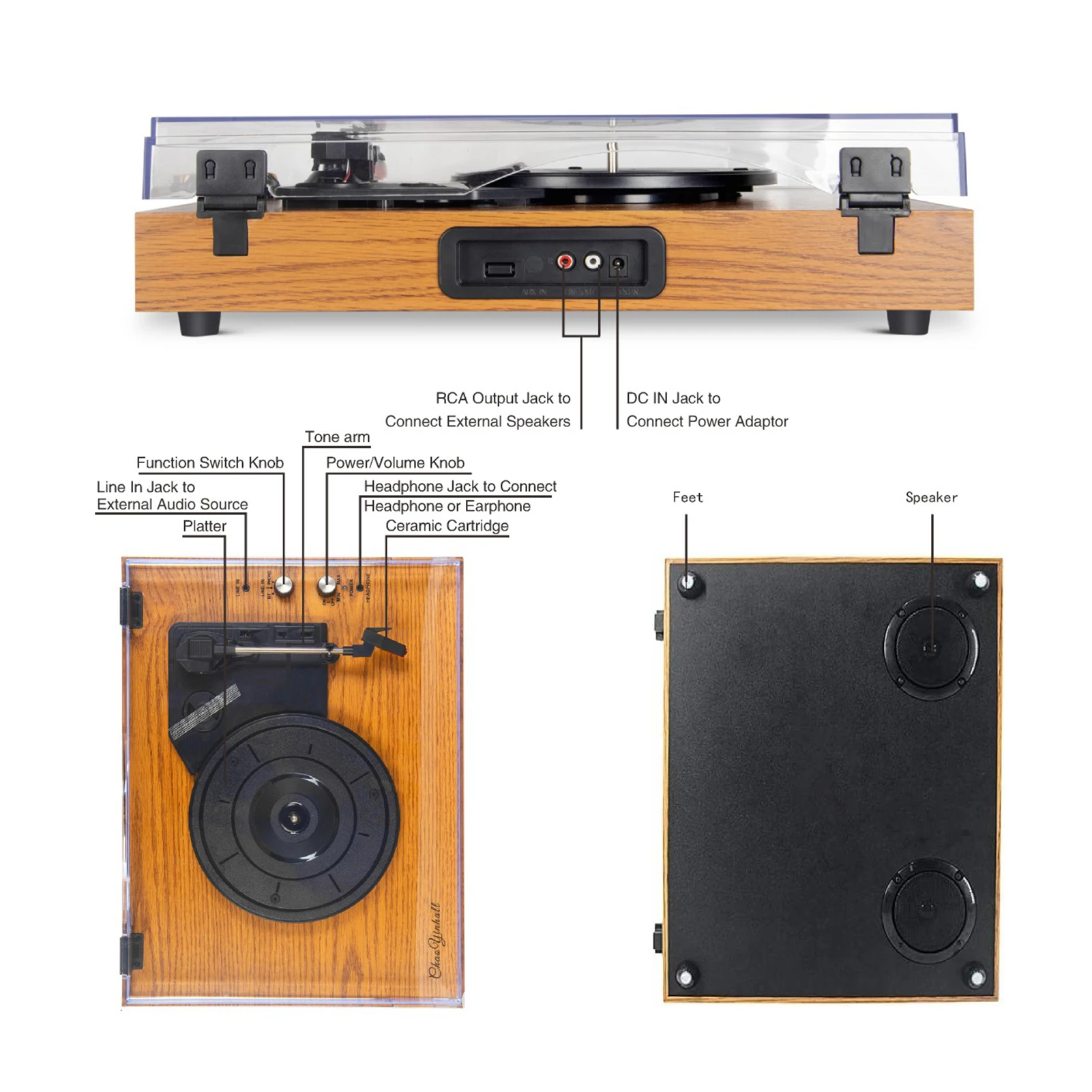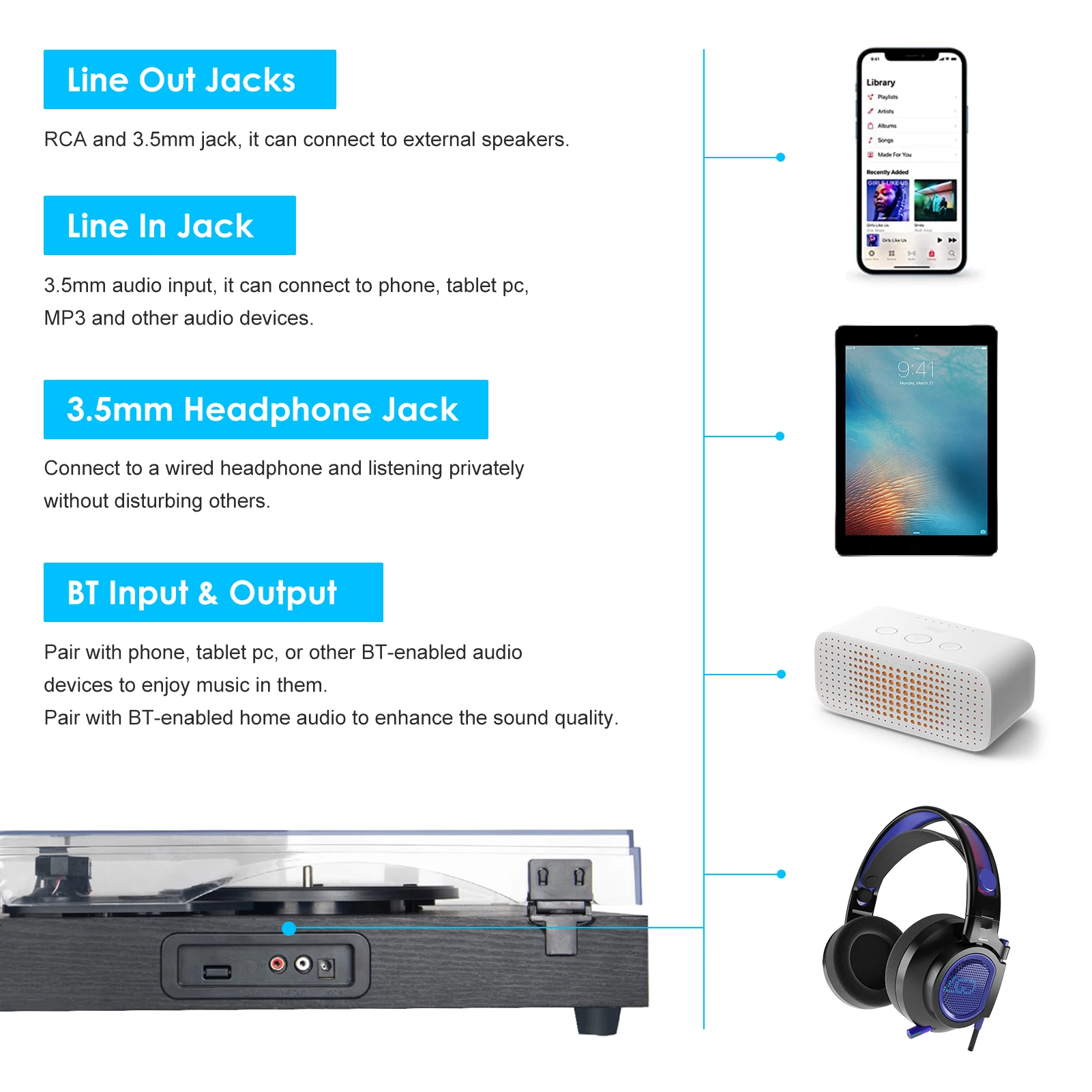 Также поддерживает аудиовход 3,5 мм, выход RCA, аудиовыход 3,5 мм и выход BT. Наслаждайтесь отдыхом с этим проигрывателем проигрывателя пластинок LP.