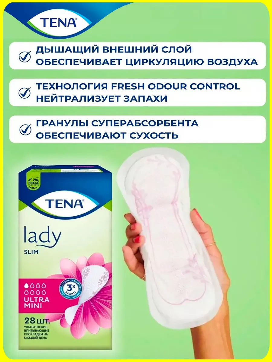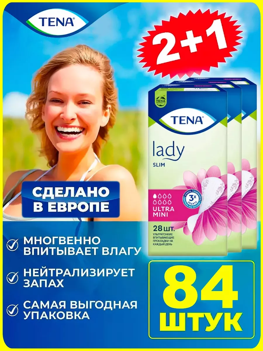 Комплектация Урологические прокладки Тена Леди Слим Ультра Мини - 3 упаковка (84шт); Урологические прокладки Tena Lady Slim Mini