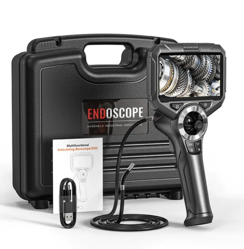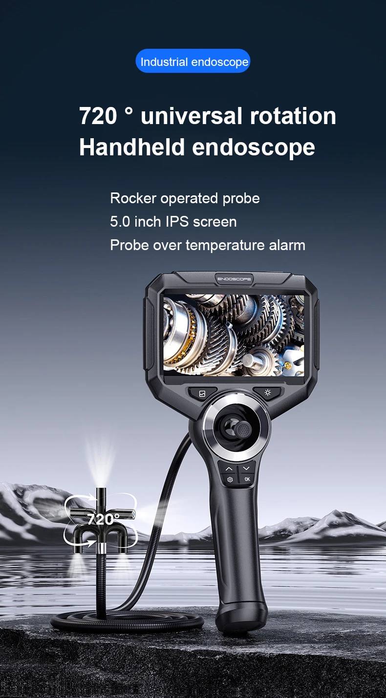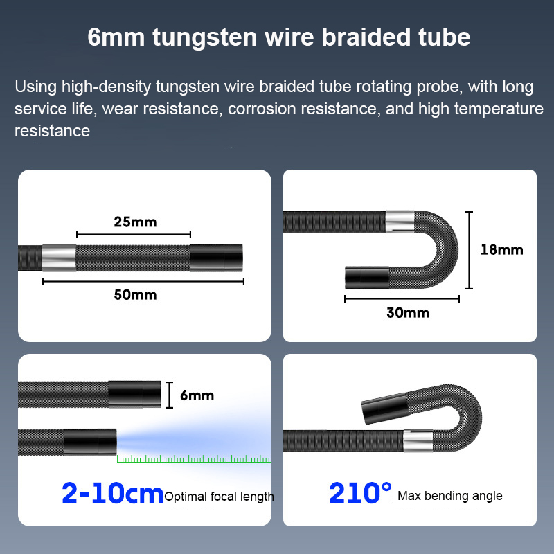 720 ° поверните эндоскоп в любом направлении, с помощью провода длиной 1 метр и диаметром 6 мм. Объектив высокой четкости 1080P автоматически отключается с защитой от высоких температур. 5-дюймовый экран высокой четкости с функцией воспроизведения видео.