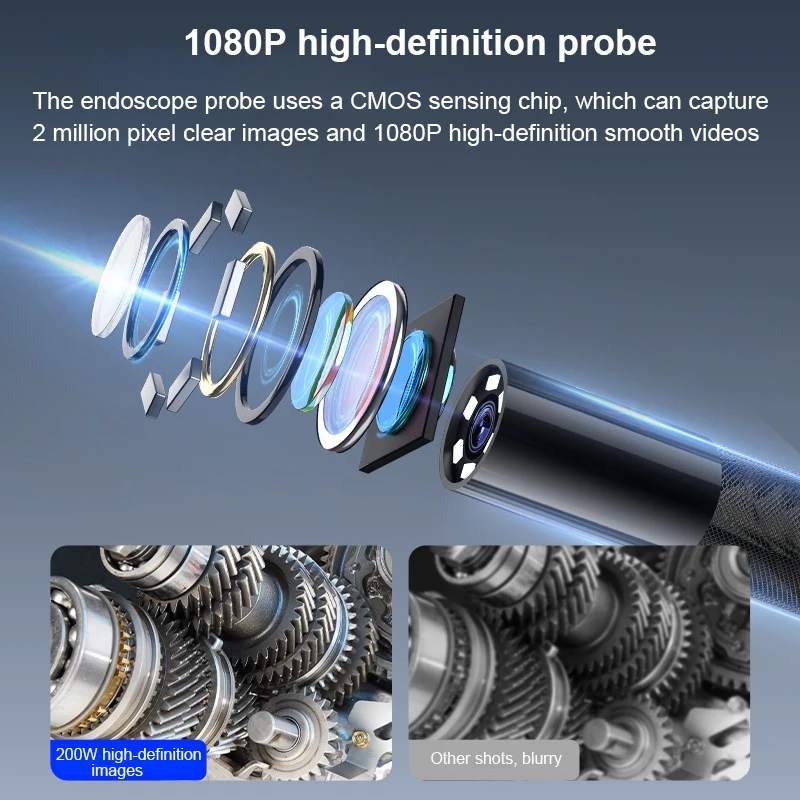 Зонд высокой четкости 1080P: зонд эндоскопа использует чип считывания CMOS, который может захватывать четкие изображения 2 миллионов пикселей и плавные видео высокой четкости 1080P.