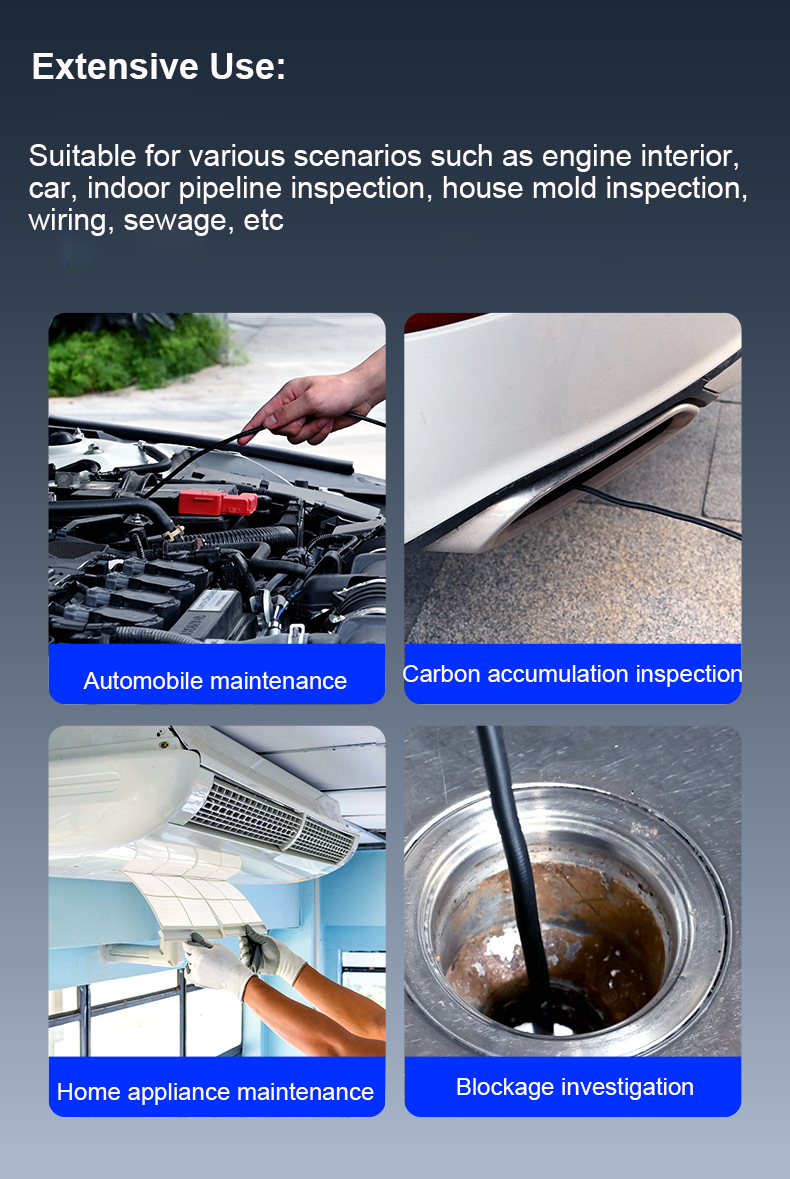 Широко применяется для различных сценариев, таких как салон двигателя, автомобиль, осмотр внутренних трубопроводов, проверка плесени в доме, проводка, канализация и т. Д., Например, техническое обслуживание автомобилей, проверка накопления углерода, обслуживание бытовой техники, и устранение неполадок блокировки.
