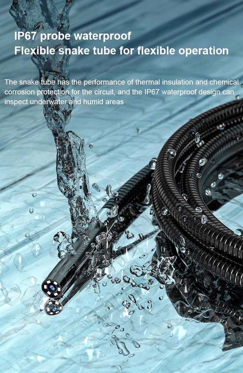 Водонепроницаемость зонда IP67: Гибкая змеевидная трубка работает гибко и обеспечивает изоляцию и защиту от химической коррозии цепи. Водонепроницаемая конструкция IP67 позволяет осматривать подводные и влажные места.
