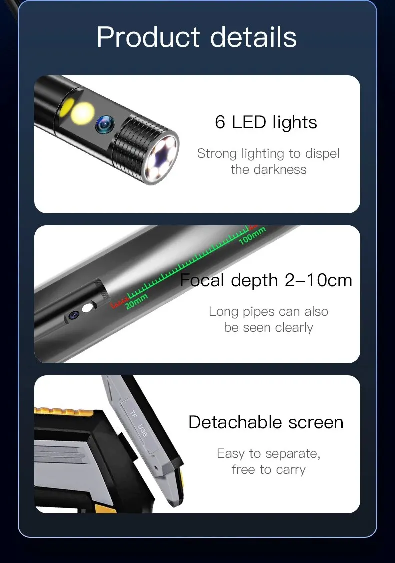 Простой в использовании Бороскоп, попрощайтесь с громоздкими плагинами. Вставьте Кабель промышленного эндоскопа, нажмите кнопку питания сбоку эндоскопа и немедленно Начните использовать эту инспекционную камеру. Больше не нужно подключать какое-либо устройство для использования. Так что не нужно беспокоиться о том, чтобы испачкать дорогой телефон на работе. Кроме того, благодаря эргономичной ручке и съемному экрану он будет более удобен в работе и удобен в хранении.
