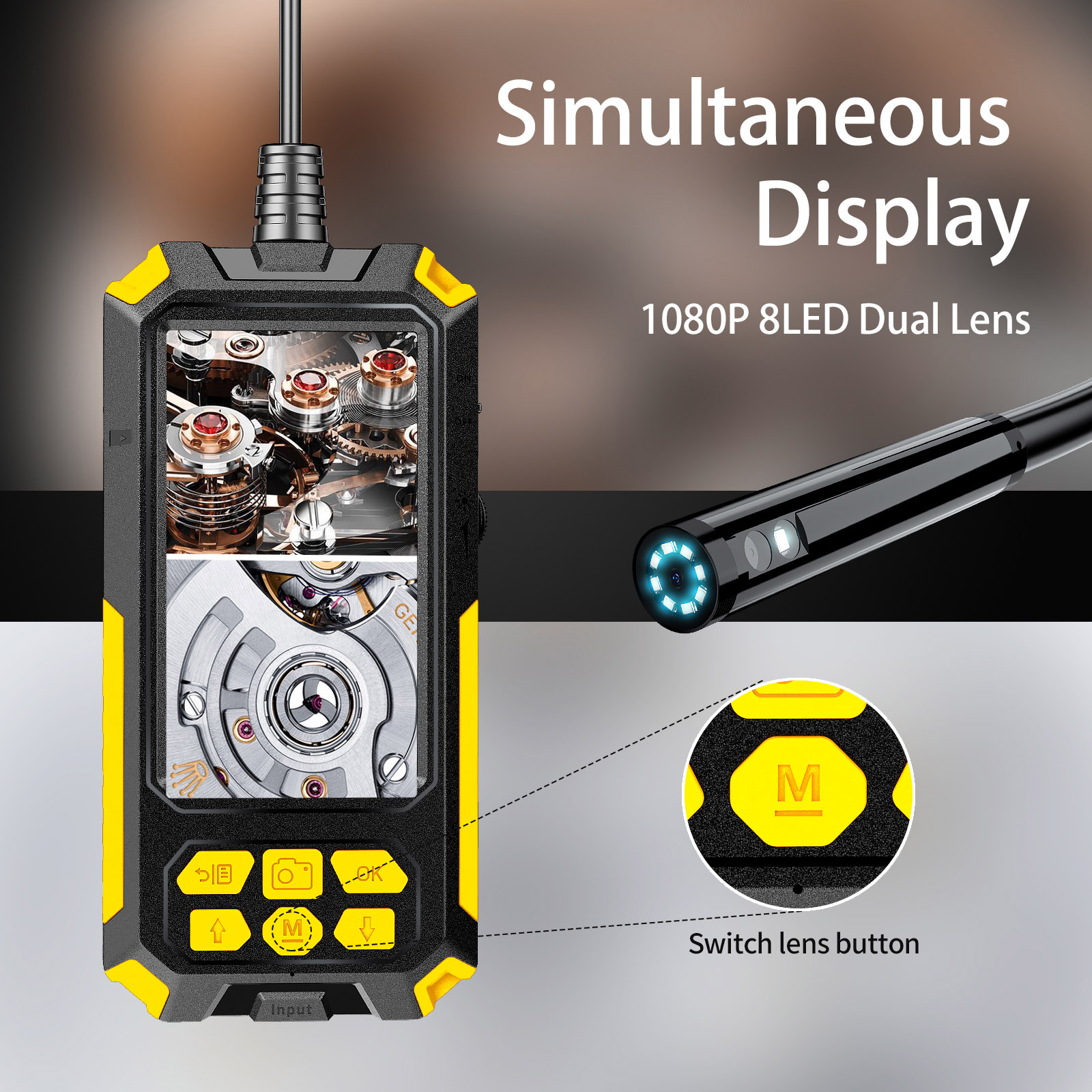 1. 【Двухобъективный эндоскоп 1080P 】 Благодаря дополнительному объективу сбоку камеры Наш эндоскоп позволяет переключать передний обзор, боковой обзор и просмотр с двумя объективами с помощью одной кнопки. Фокусный диапазон передней камеры составляет 4-5 м, лучший фокусный диапазон составляет 3-16 см, а боковая камера-3-10 см.