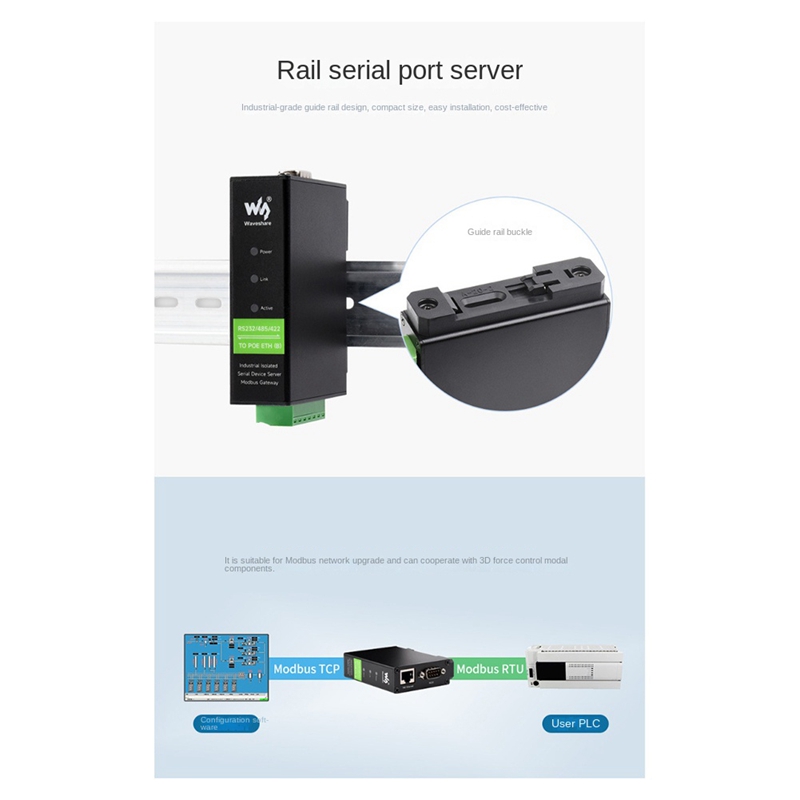 Промышленный изолированный TCP/IP Waveshare для последовательного модуля рельсового типа последовательного сервера [с POE]