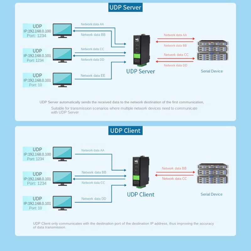 Режим работы: TCP сервер, TCP клиент (TCP сервер также сосуществуют), UDP, UDP Многоадресная рассылка