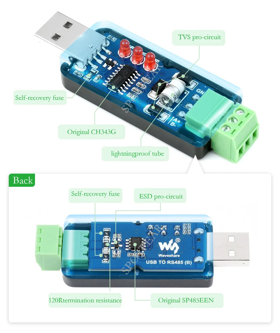 Это промышленный двунаправленный преобразователь USB в RS485 с оригинальными CH343G и SP485EEN внутри. Он имеет встроенные схемы защиты, такие как защита от света, сбрасываемый предохранитель, Защита от электростатического разряда, Диод TVS и т. Д. Он Довольно маленький по размеру.