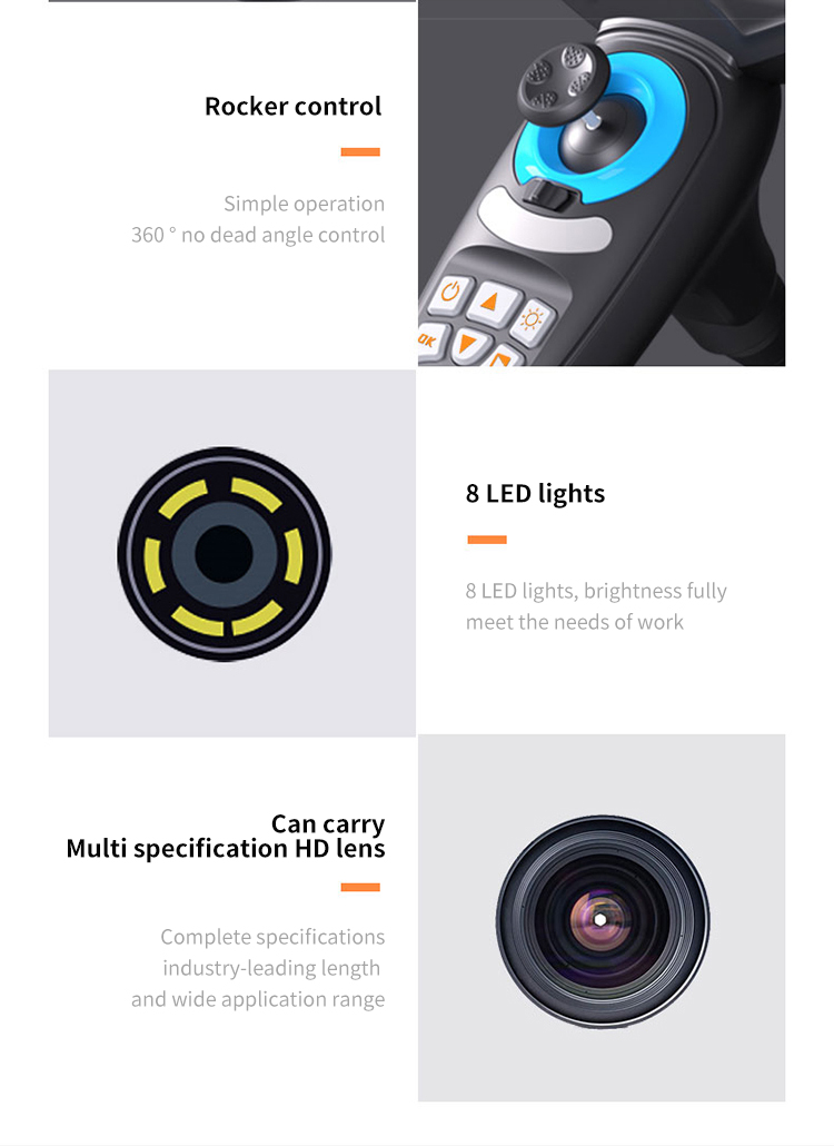 1. Портативный дизайн, простота в эксплуатации, длительный рабочий день, проверка коррозии, трещин, сварки, посторонних веществ, износа и обработки внутренних деталей различных промышленных трубопроводов или сложного оборудования в узком пространстве, и пройти прекрасное комплексное тестирование;
