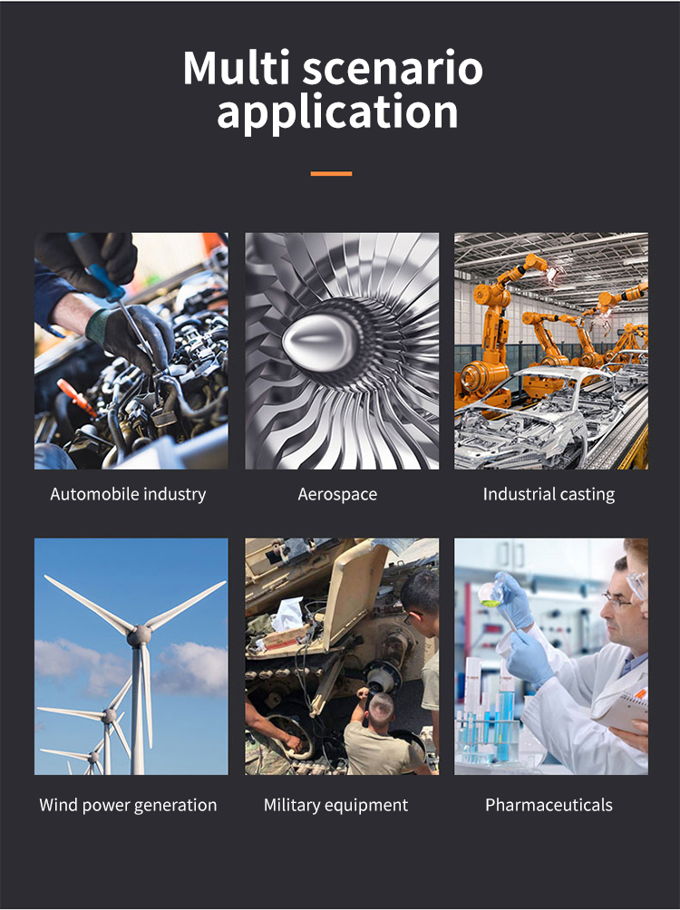 Промышленное литье: в основном используется для контроля качества при механической обработке. Такие, как тестирование различных частей литья, гидравлического литья, корпуса насоса и клапана литья тела, механические части литья, трубопроводная арматура литейные единицы, используемые для проверки контроля качества литья песка включения, заусенцы и ступенчатые отверстия.