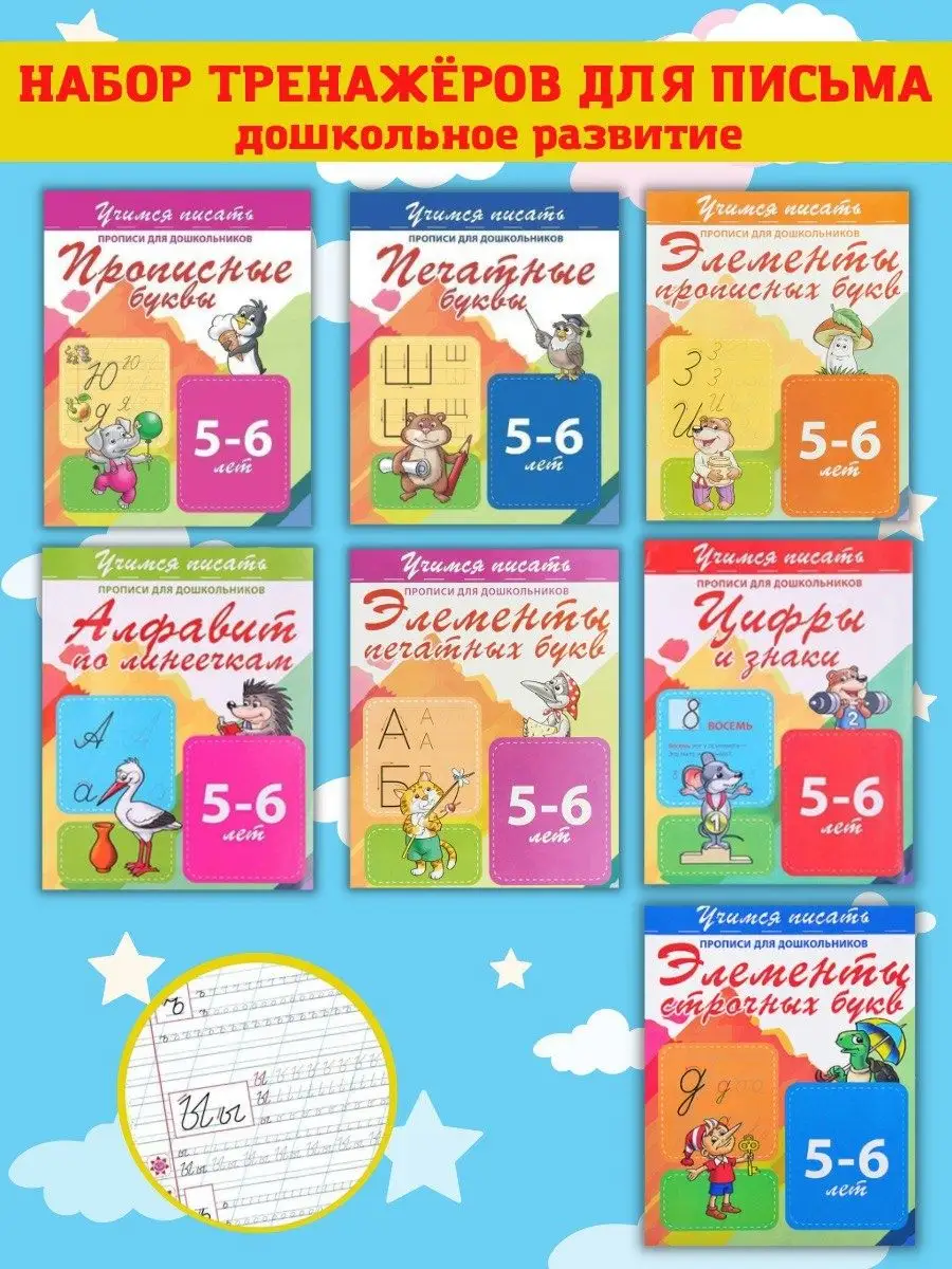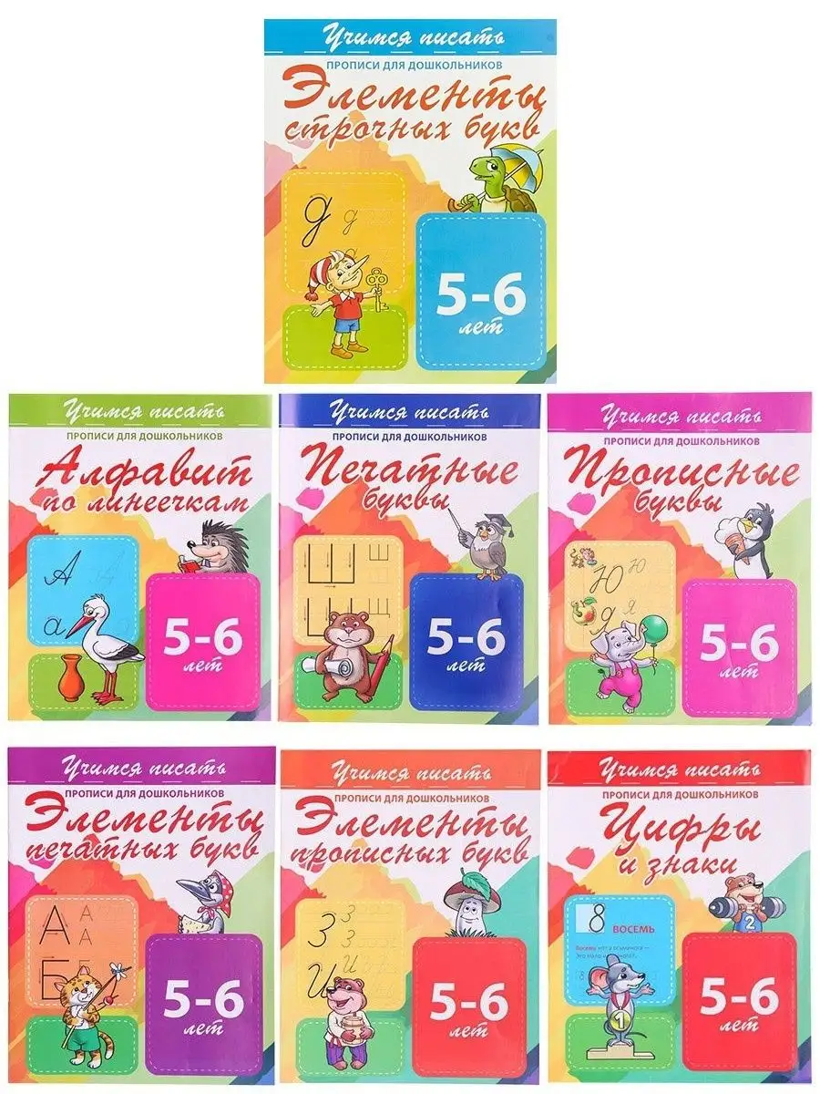 Описание: Набор 7 прописи для дошкольников. Алфавит по Линеечкам. Печатные буквы.Прописные буквы. Цифры и знаки. Элементы печатных букв. Элементы прописных букв. Элементы строчных букв.
