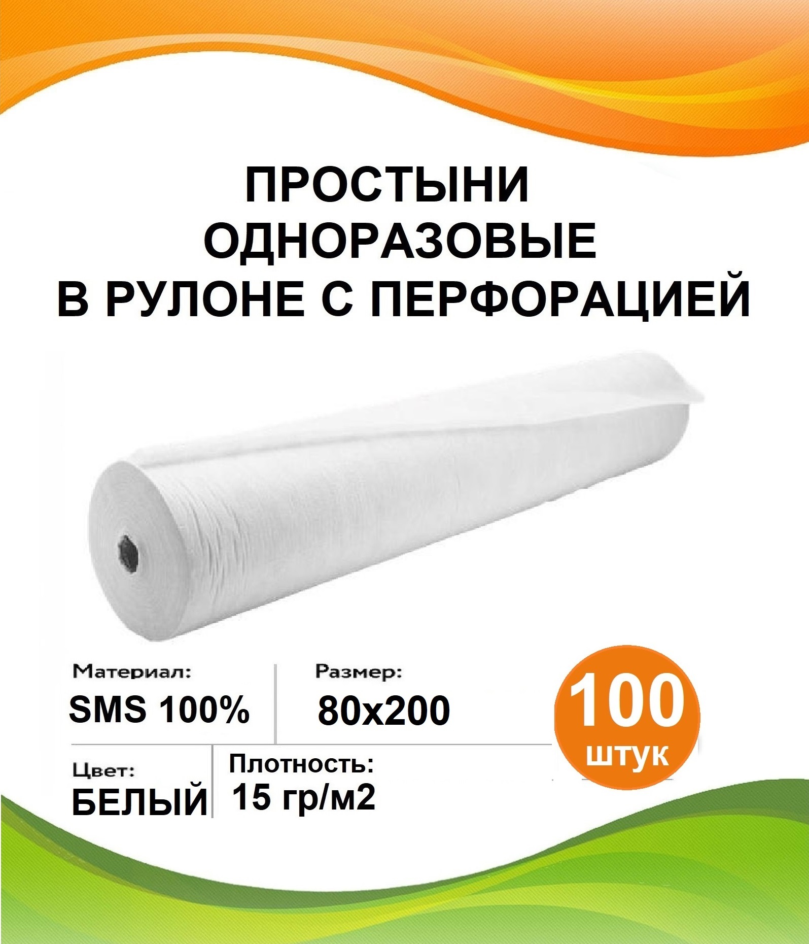 Простыни одноразовые в рулоне 80х200 белые 100 шт 15 гр/м2 медицинские с перфорацией, спанбонд, для массажа, для кушетки 80*200, простынь одноразовая рулон