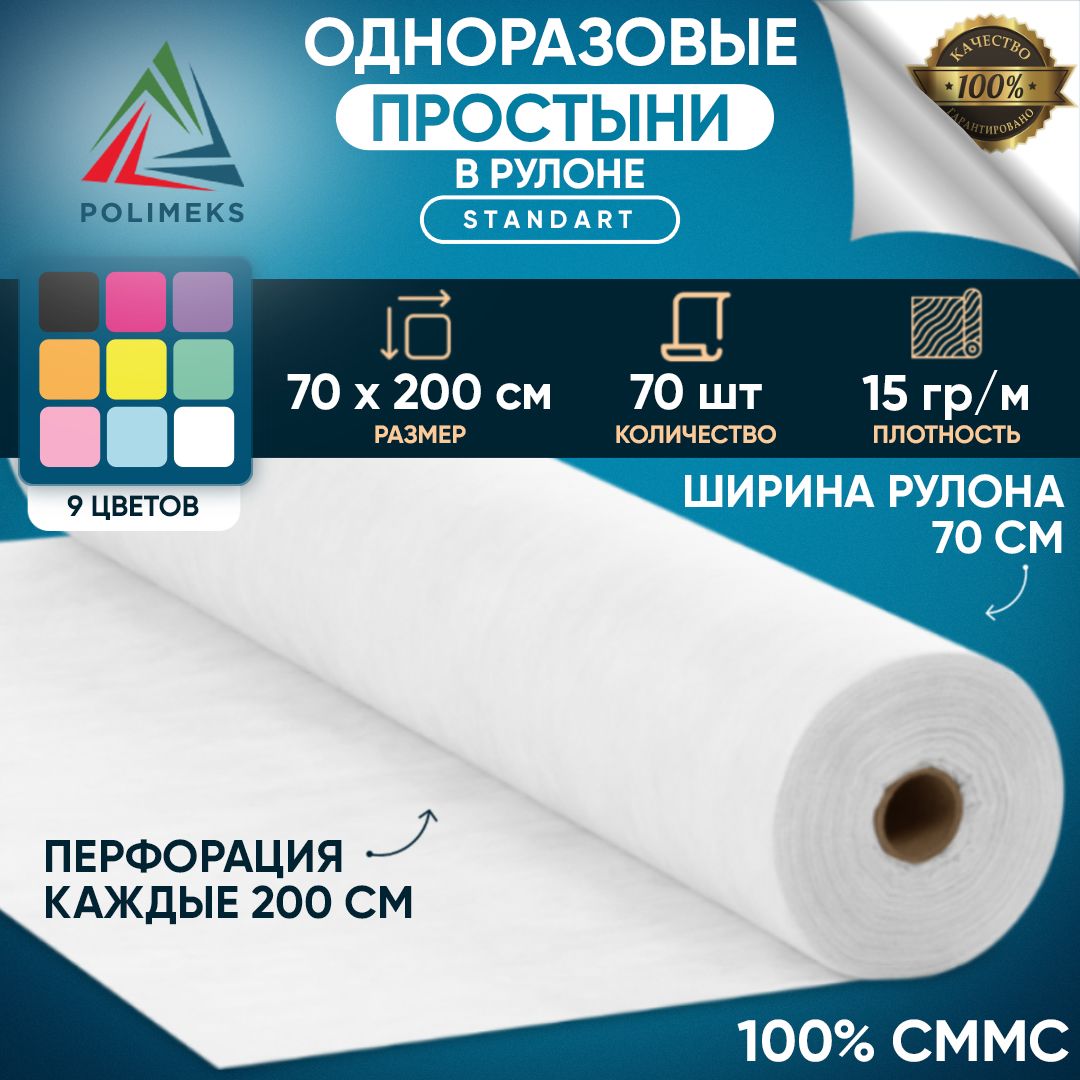 Простыни одноразовые в рулоне Polimeks 70 х 200 см, 70 штук, пеленка медицинская на кушетку, 100% СММС, белые, Полимекс. Плотность 15 г/м2.