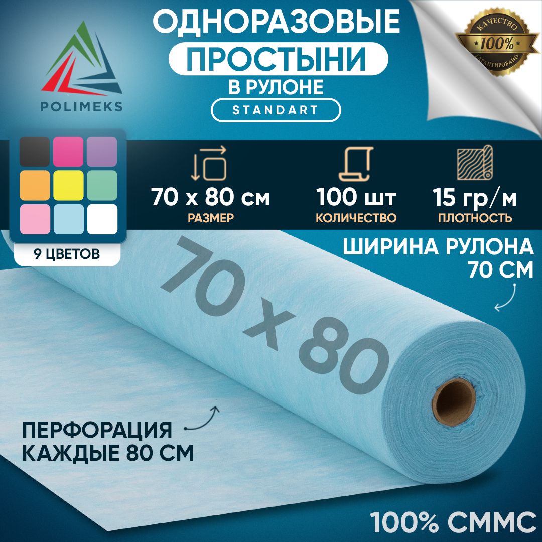 Простыни одноразовые в рулоне Polimeks 70 х 80 см , пеленка медицинская на кушетку , 100% СММС , 100 штук , голубые, Полимекс. Плотность 15 г/м2