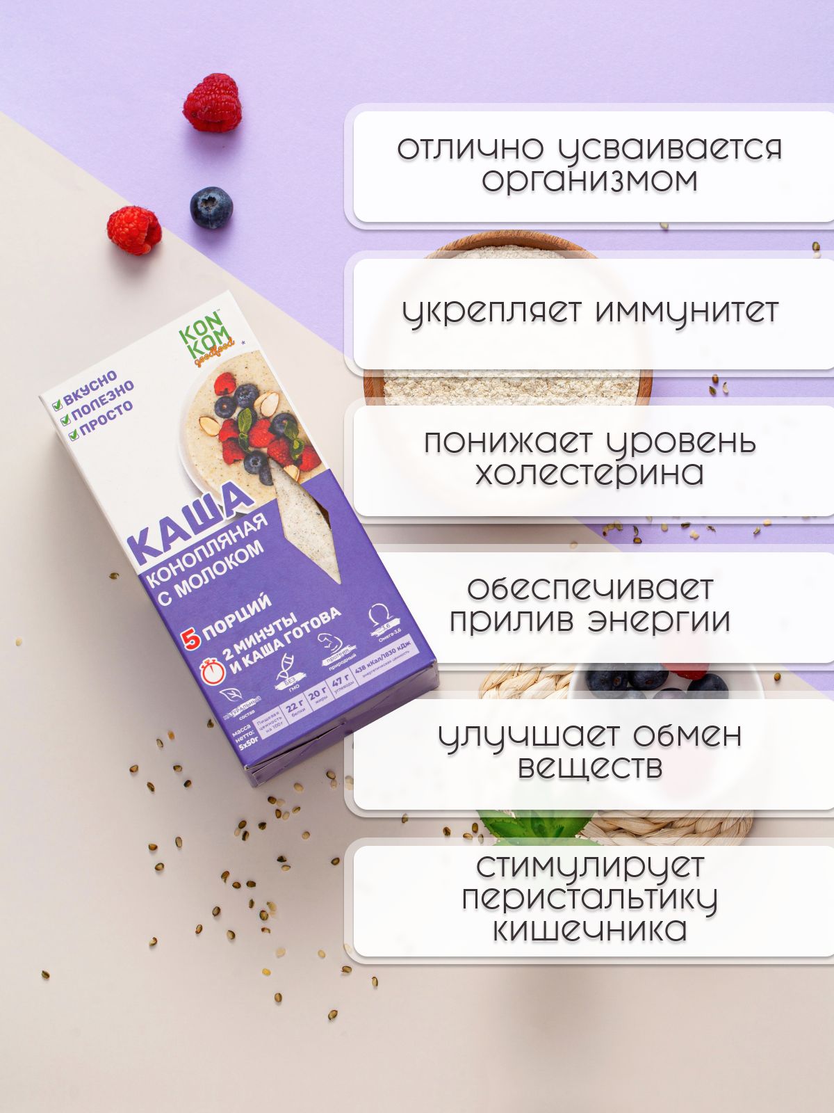 Каша быстрого приготовления в упаковке 5 пакетиков по 50 г, 1 пакетик на 1 прием. Конопляная каша из конопляных ядер и овсяных хлопьев и молоком. Прекрасное начало вашего дня.