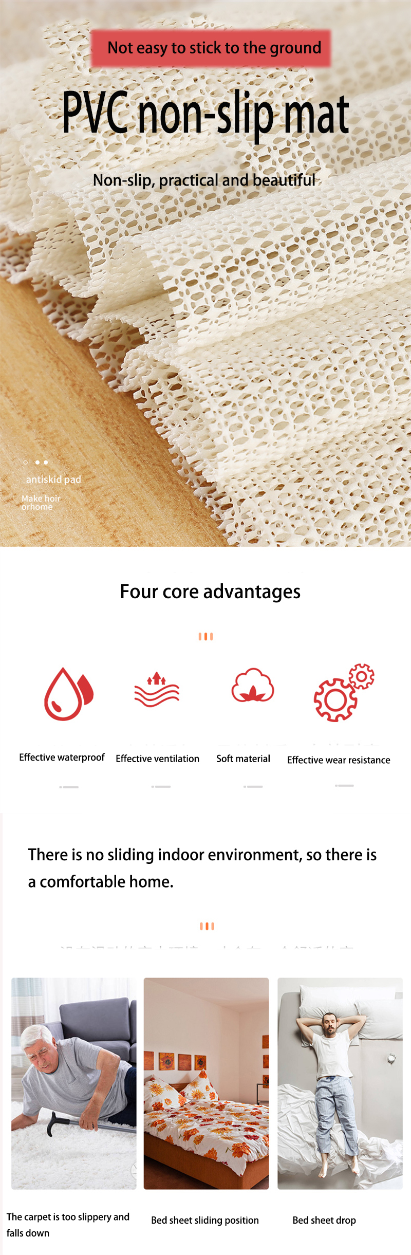 Использование: под латексными матрасами, тонкими матрасами, коврами, ковриками, ковриками для льда, матрасами для Маджонга, матрасами и т. д., противоскользящий эффект очень хорош и не может быть пят