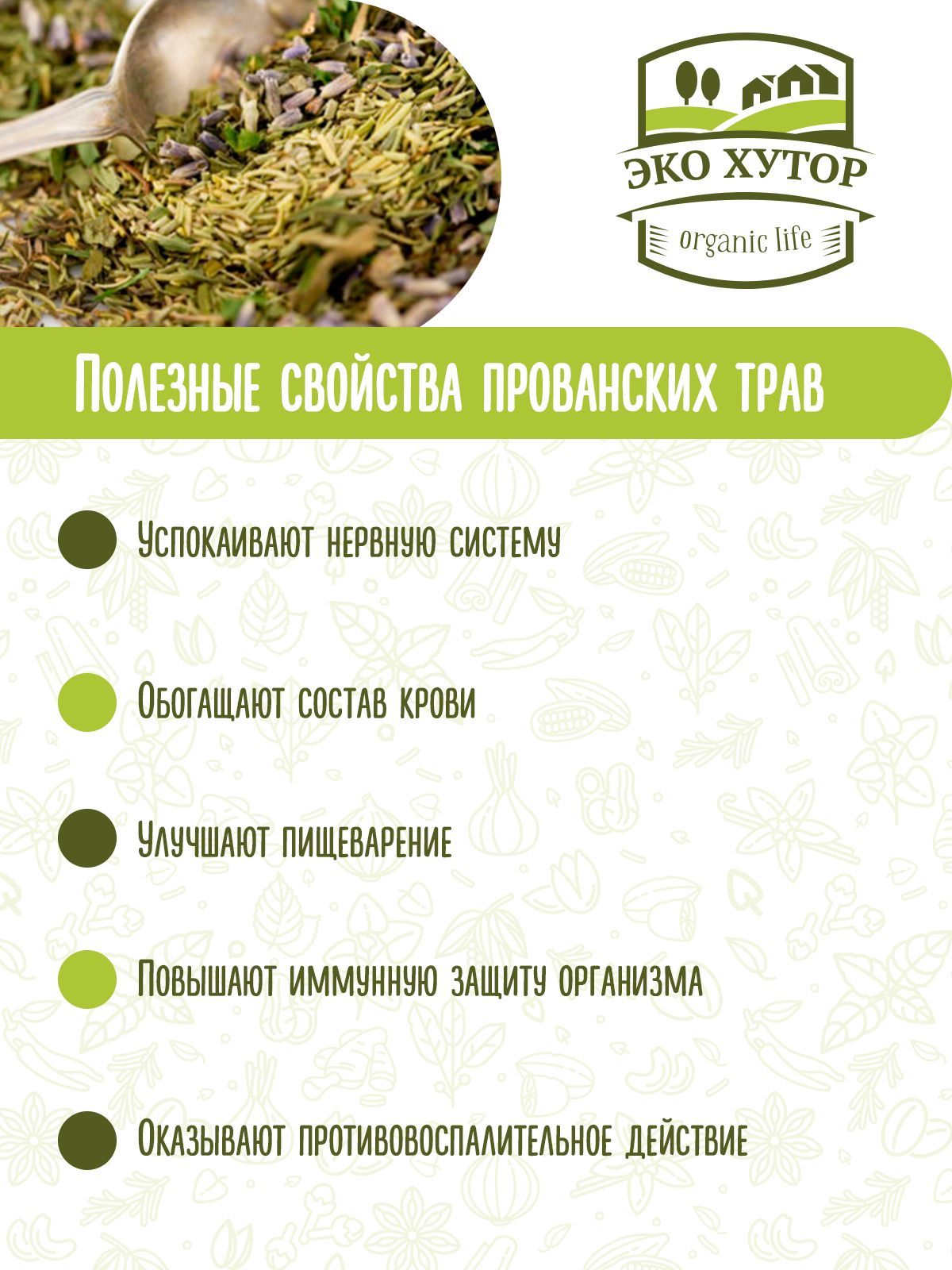 Описание: Прованские травы Эко-хутор — это универсальная приправа, родом из Прованса, юго-восточного региона Франции, который славится бескрайними полями, где растёт не только лаванда, но и целая палитра душистых полевых трав. Свою популярность смесь получила в 17 веке. Дворянство Франции считало, что именно такая композиция способна привлечь противоположный пол, являясь мощным афродизиаком. Мировую известность «Прованские травы» получили лишь 50 лет назад, произведя фурор среди кулинаров и домохозяек по всему миру. Прованские травы - это смесь приправ, которая добавляет вкус и аромат вашим блюдам. Это популярная специя, которая используется во многих кухнях мира.