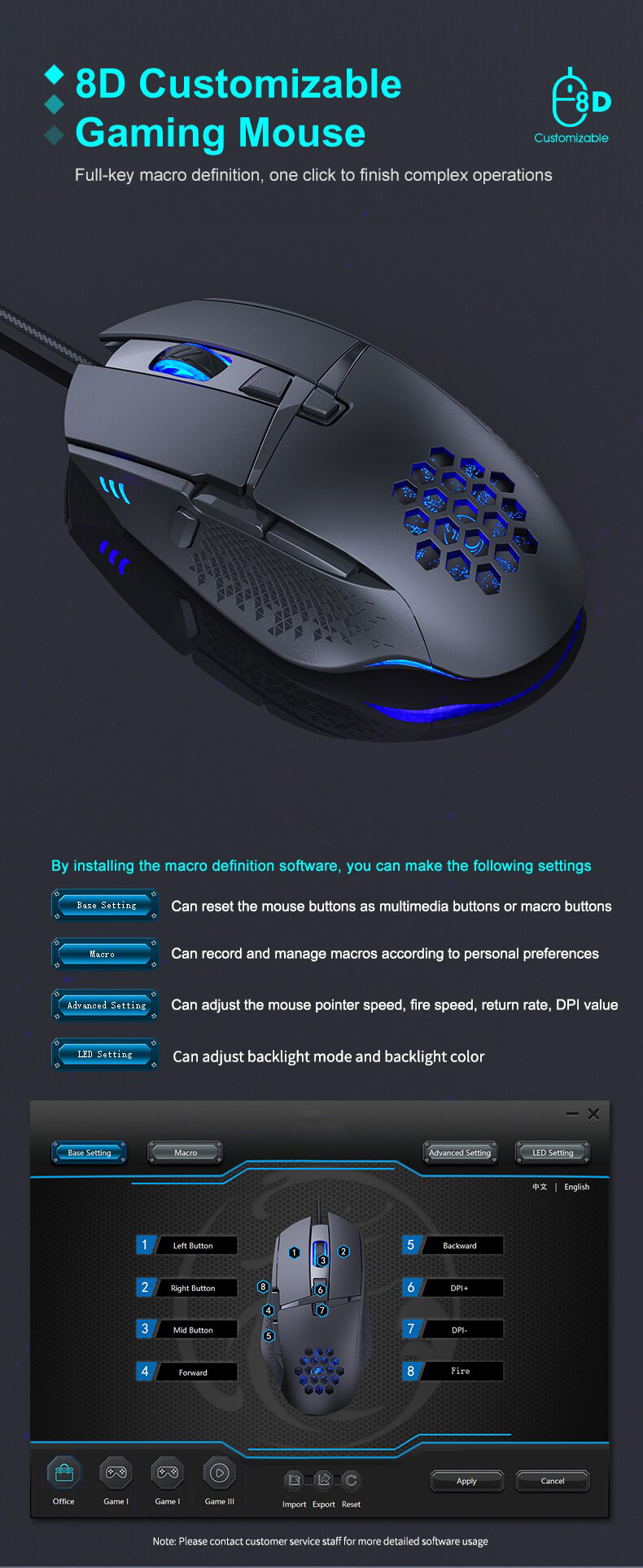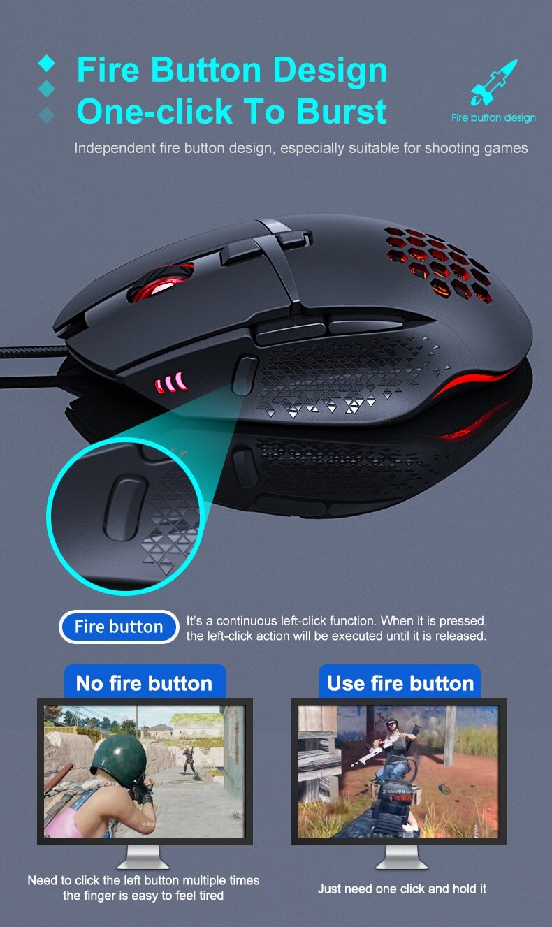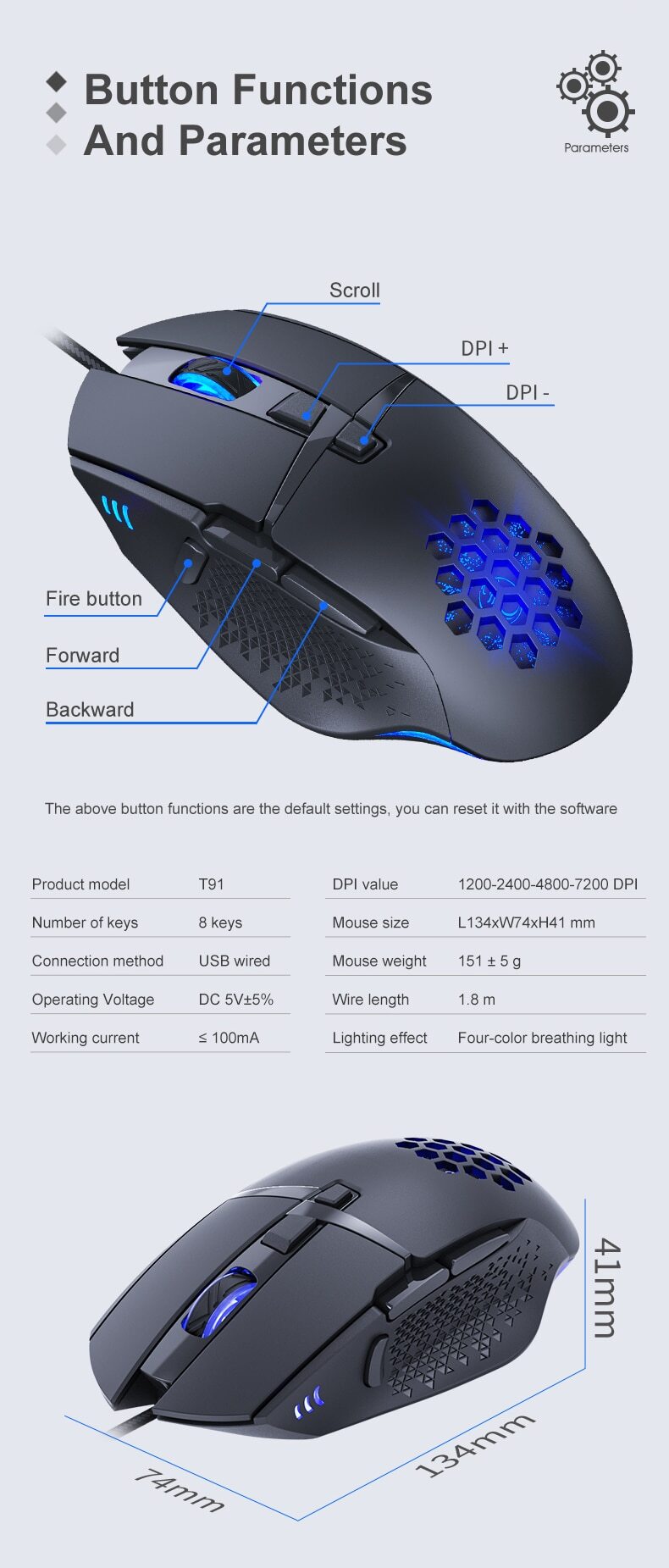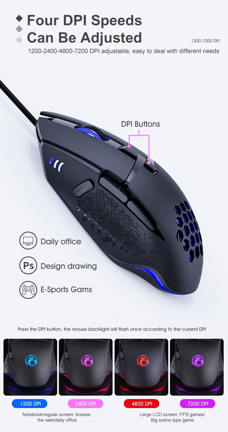 • Компьютерная проводная игровая мышь имеет 5 переключателей DPI ( 1200, 2400, 4800, 7200) свободно изменяют скорость мыши.