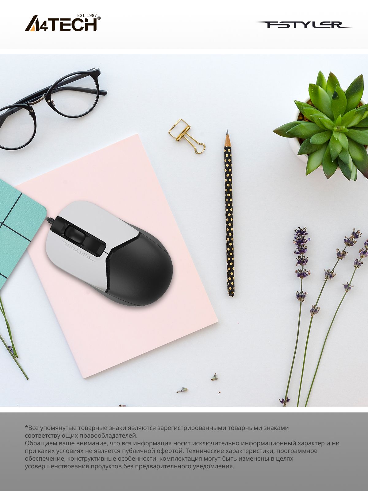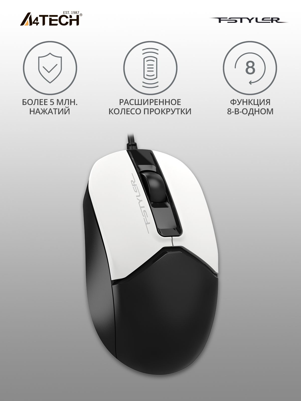 Проводная оптическая мышь с бесшумным кликом A4Tech Fstyler FM12S, 1200dpi, 3 кнопки, silent