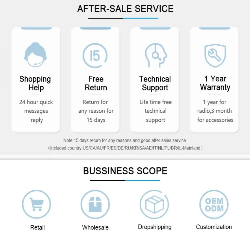 Перед доставкой мы проверим качество товаров строго один за другим, пожизненную гарантию на радиоведущую и аксессуары, но вы не можете гарантировать, что какая-то непредсказуемая причина указана, пожалуйста, немедленно свяжитесь с нами, если вы получите дефект, спасибо