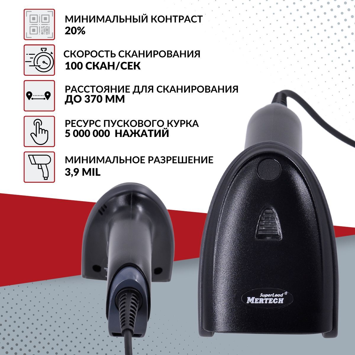 Описание: Стильный, надежный и удобный проводной ручной сканер штрих кода MERTECH 2210 USB Black.
