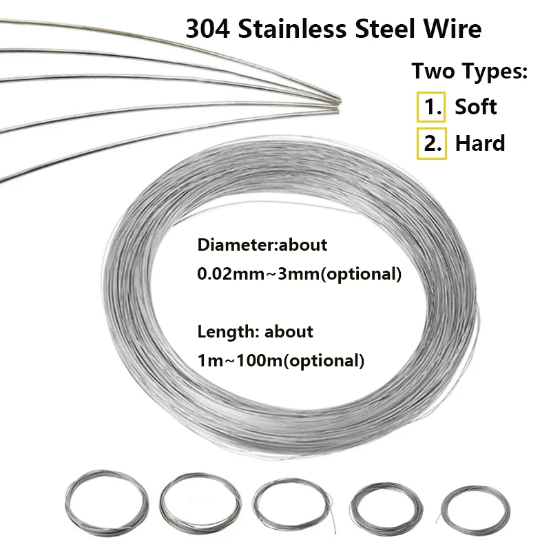 304 Проволока из нержавеющей стали, разделенная на проволоку средней жесткости и мягкую проволоку (мягкая проволока почти так же мягкая, как железная проволока, и подходит для связывания. Проволока средней жесткости относительно твердая, похожа на аргон стержень для дуговой сварки и подходит для обработки)
