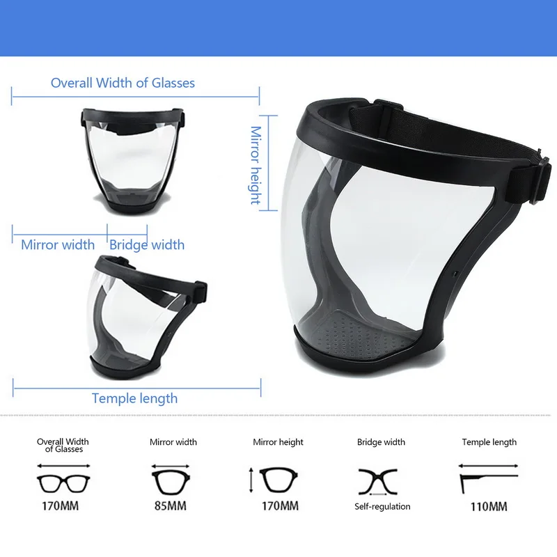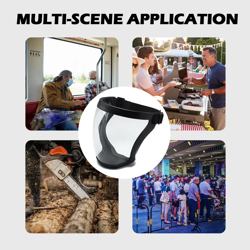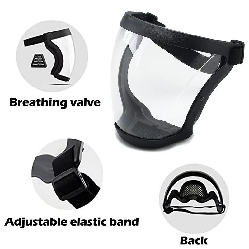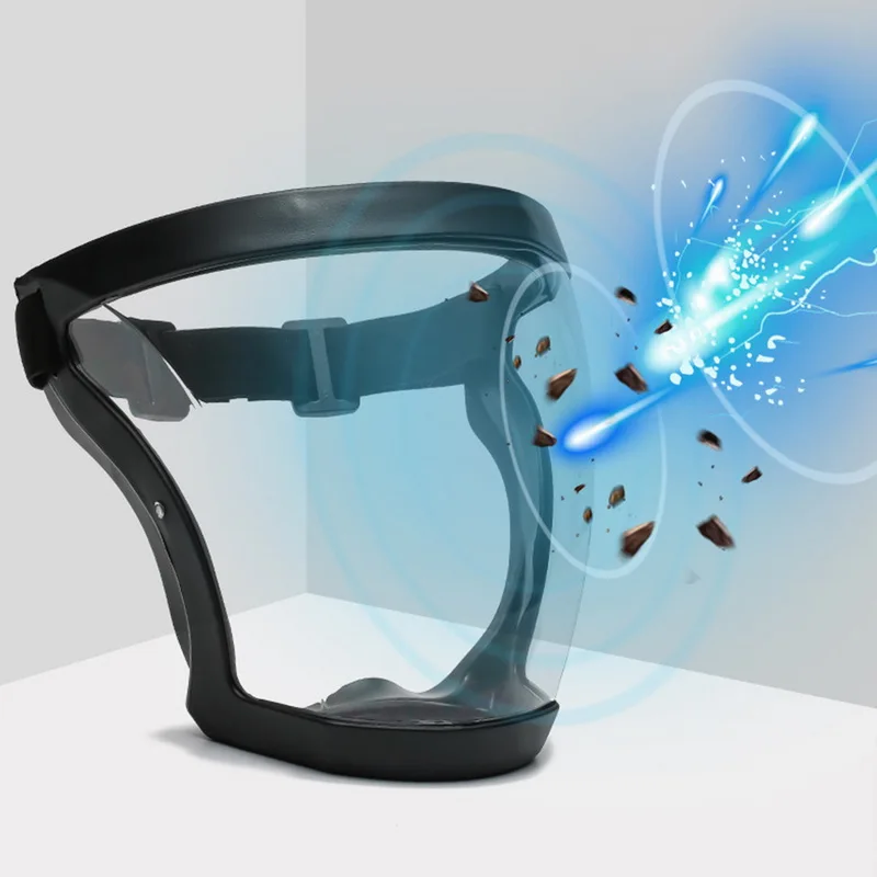 1. 【Полная защита】-Прозрачный, легкий, удобный, дышащий, идеально подходит для защиты глаз, рта, носа от летящих обломков, капель, аэрозолей, спреев и брызг.