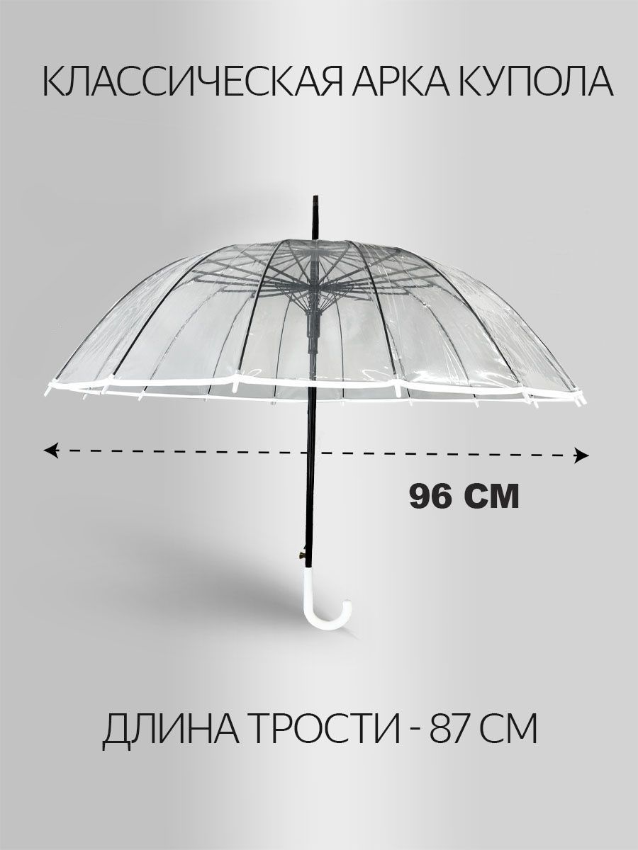 Описание: Этот стильный прозрачный зонт имеет купол, выполненный из ПВХ, диаметром 99 см. Зонт полуавтомат открывается нажатием на кнопку. Зонт-трость женский имеет 16 спиц что делает его более ветроустойчивым и продлевает срок службы. Зонт сопровождается чехлом, который дополнительно защитит его от повреждений и сохранит его в идеальном состоянии на протяжении долгого времени. Купол зонтика украшен белым кантом по краю, который придает ему особый шарм и элегантность. Благодаря своему дизайну, этот зонт с прозрачным куполом станет стильным аксессуаром для различных мероприятий, таких как фотосессии, свадьбы, прогулки или даже для использования в качестве подарка для невесты, дочери, жены или девушки на День рождения, 8 марта или просто так. Широкая арка купола зонта-трость делает его подходящим для детей и взрослых, и вы сможете использовать его в любую погоду. Кроме того, зонт женский подойдет для различных стилей одежды, и вы всегда будете выглядеть стильно и необычно с ним в руках. В целом, женский зонт трость с прозрачным куполом - отличный выбор для тех, кто ищет необычный аксессуар. Он стильный, элегантный, удобный в использовании и его можно использовать в любое время года.