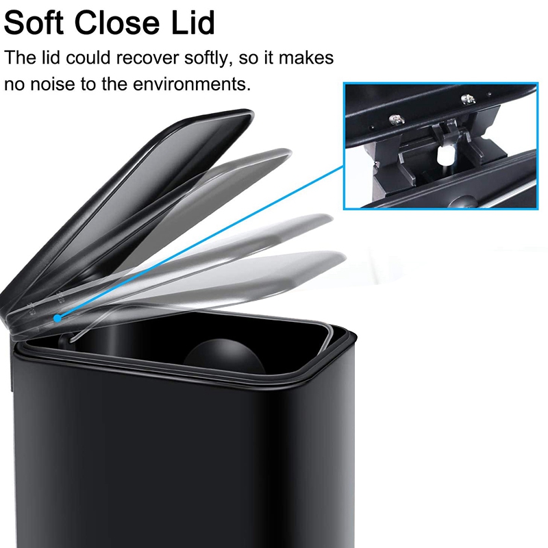 5. Отключите звук, чтобы закрыть крышку и держать крышку открытой: Улучшенный рычажный механизм может тихо и аккуратно снизить высоту крышки, чтобы она не упала и не издавала звук, И все запахи можно сохранить и предотвратить распространение, пока вам не понадобится очистить мусорную корзину. Крышка остается открытой, крышку можно держать открытой в течение любого времени, что очень подходит для более длительной работы по дому.