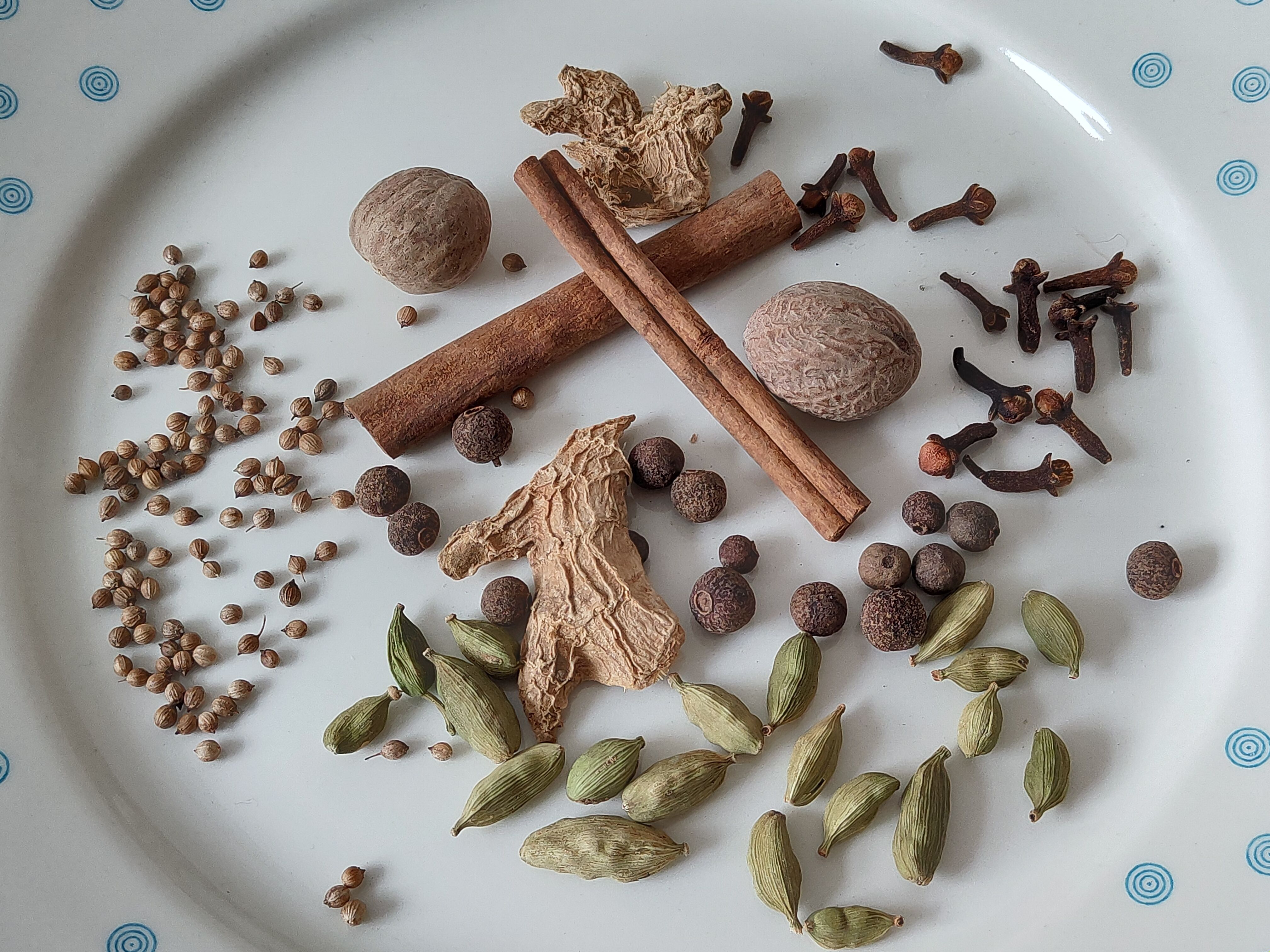 Корица, кардамон, имбирь, мускатный орех, кориандр, душистый перец, гвоздика - молотые.