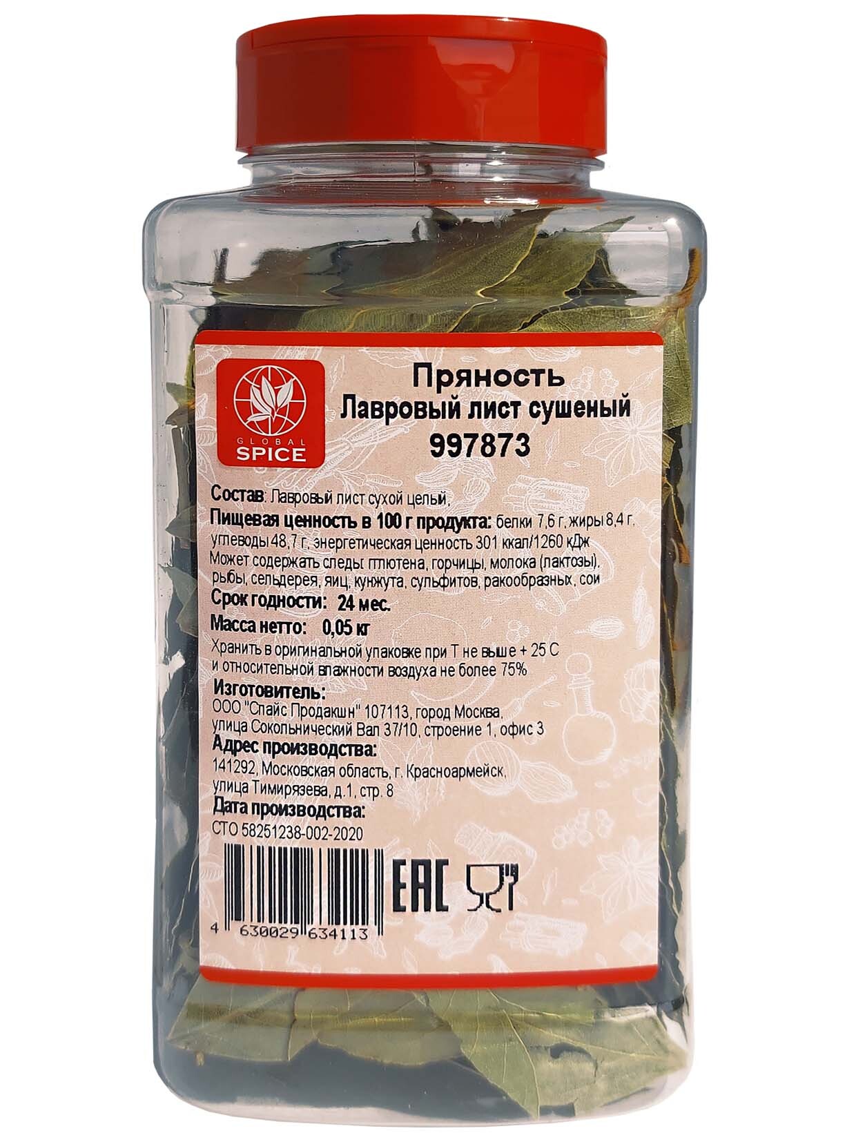 Пряность Лавровый Лист целый для бульонов, пельменей, маринования Global Spice. Банка с дозатором, 50 г