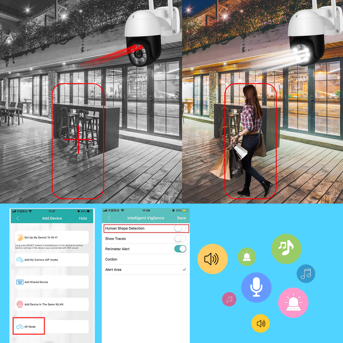 Настройка трех ночных режимов: черный свет полноцветное инфракрасное ночное видение, двойное световое предупреждение;