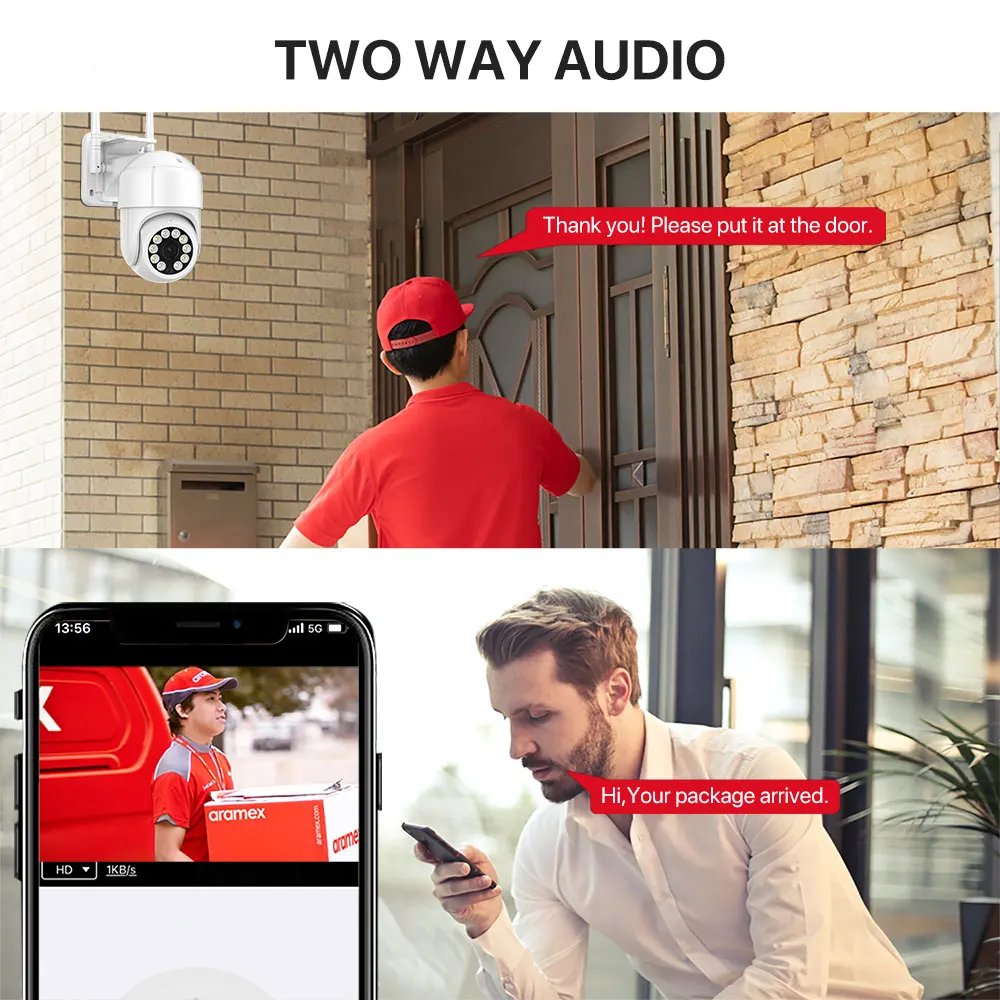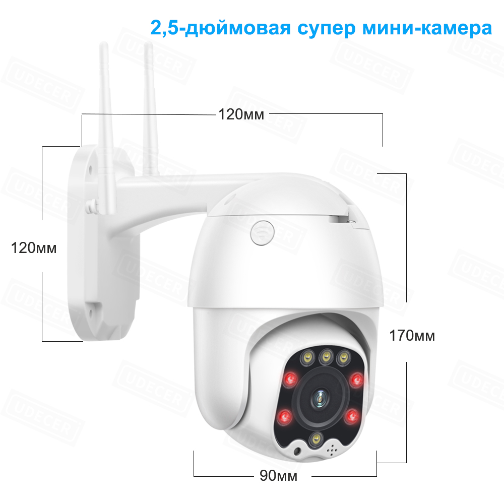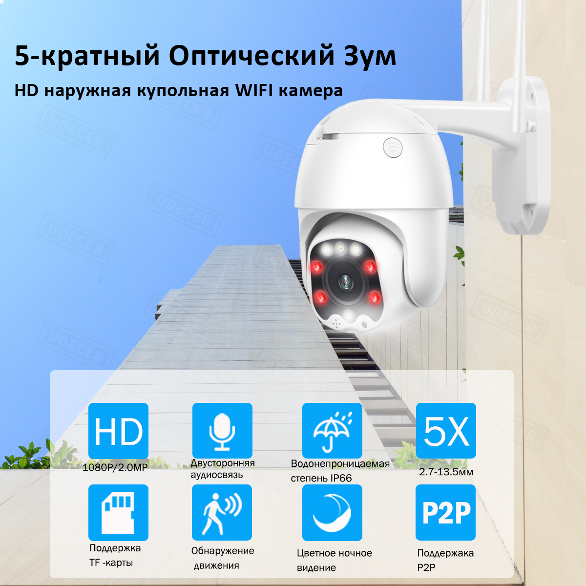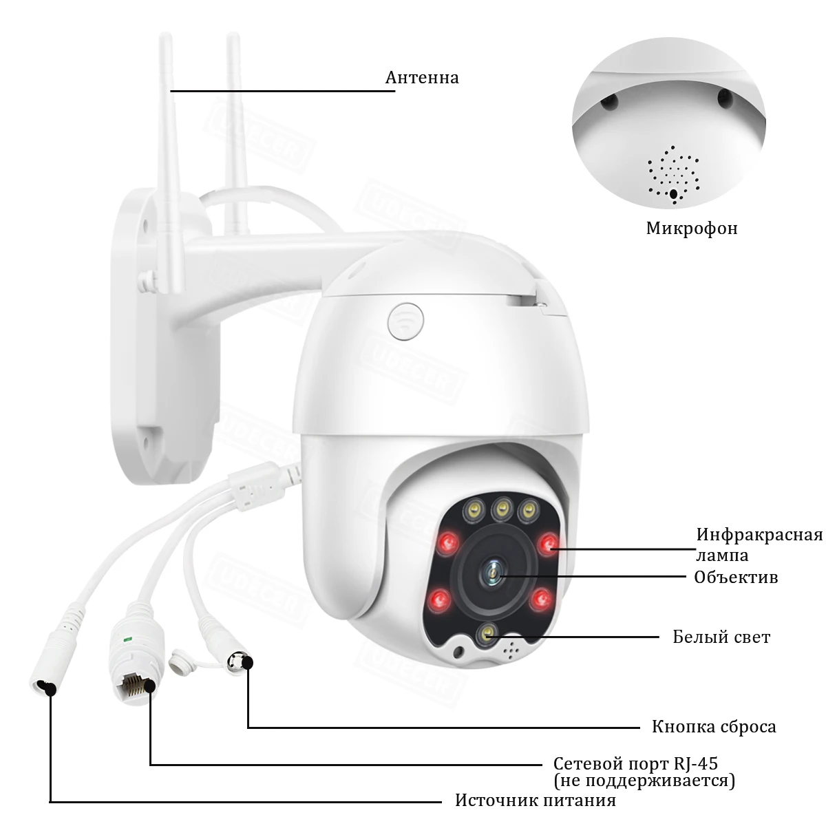 - Разрешение HD 1080P: изображение высокой четкости 2,0 МP, четкие и качественные изображения. Максимальный размер изображения 1920 * 1080. Работа только на 2,4 G, а не на 5G - Аудиозапись: функция записи звука вокруг камеры, которая больше всего отличается от камеры без аудиозаписи. Его преимущества включают четкий эффект прослушивания и детальную запись, сохранение голосовых свидетельств, точное воспроизведение звука для записи важных звуковых свидетельств. - Уведомление при обнаружении движения: камера обнаруживает движущегося человека и будет отправлять тревожное сообщение на мобильный телефон. - Управление PTZ: поворот составляет 355° по горизонтали и поворот на 90 ° по вертикали. Мобильный телефон может контролировать угол поворота стабилизатора, и вы можете видеть необходимое направление. - Двусторонняя аудиосвязь: характеристика шума фильтра, более четкий звук, двусторонняя речь в реальном времени позволяет легко решать различные проблемы. - Мобильное видеонаблюдение: при поддержке мобильного телефона с системой iOS, Android, дистанционное наблюдение с мобильных телефонов позволяет просматривать и контролировать в любое время. - Водонепроницаемость IP66: профессиональный водонепроницаемый дизайн, водонепроницаемость на открытом воздухе, хорошая герметичность, вам не нужно беспокоиться о дожде. - Инфракрасное ночное видение: самое дальнее ИК-расстояние 8 светодиодов составляет до 30 м.