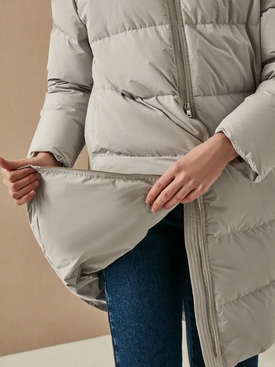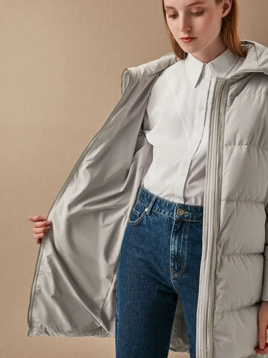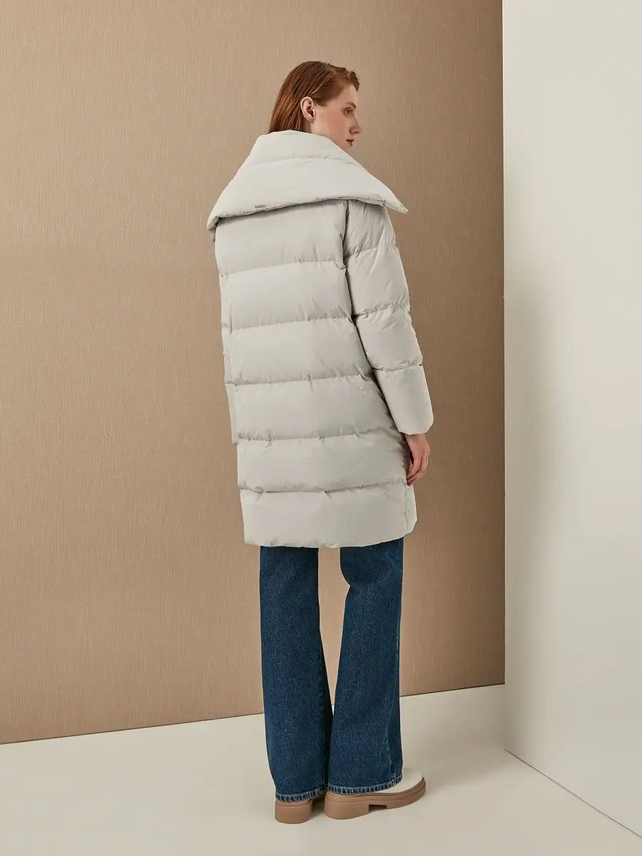 Описание: Базовый пуховик светло-серого цвета с объёмным воротником-стойкой с отделочной тесьмой. Широкая фирменная простёжка обеспечивает оптимальное распределение утеплителя. Прочный непродуваемый материал защитит от непогоды, а натуральные пух и перо поддержат комфортную температуру. Модель прямого силуэта, среднего объёма, с центральной застёжкой на тесьму-молнию, длинным рукавом с манжетом из кошкорсе и карманами в боковом шве. Универсальный пуховик отлично впишется в повседневный демисезонный гардер