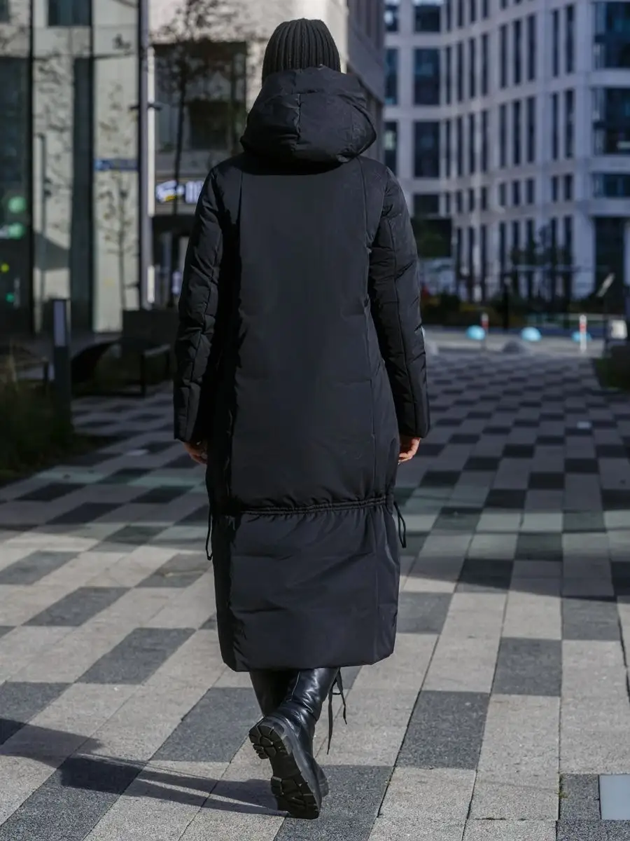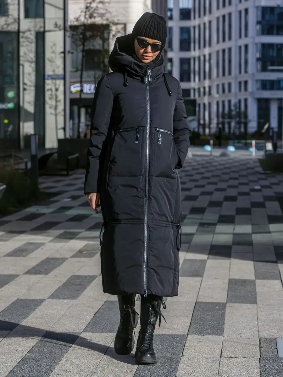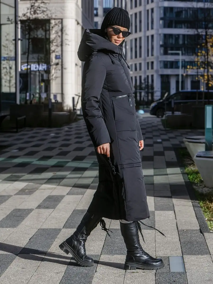 Особенности модели Теплый женский длинный пуховки с капюшоном и стягивающимся низом