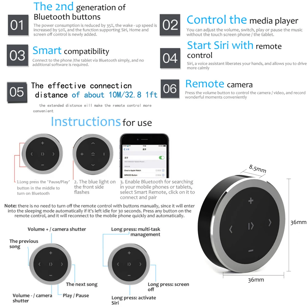 Эта мультимедийная Кнопка Bluetooth позволяет вам управлять музыкой у себя под рукой одним нажатием, когда ваш смартфон/планшет находится вне досягаемости.