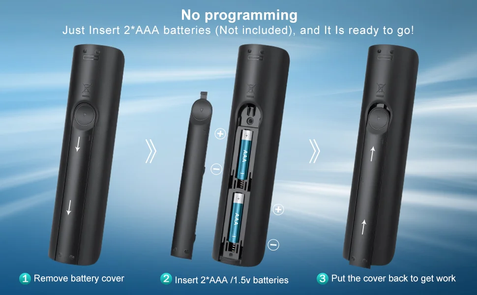 【Простота использования】 Использование нашего сменного пульта дистанционного управления не может быть проще, так как не требуется Программирование или Настройка. Просто Вставьте 2 батарейки AAA, и все готово! (батарейки в комплект не входят)