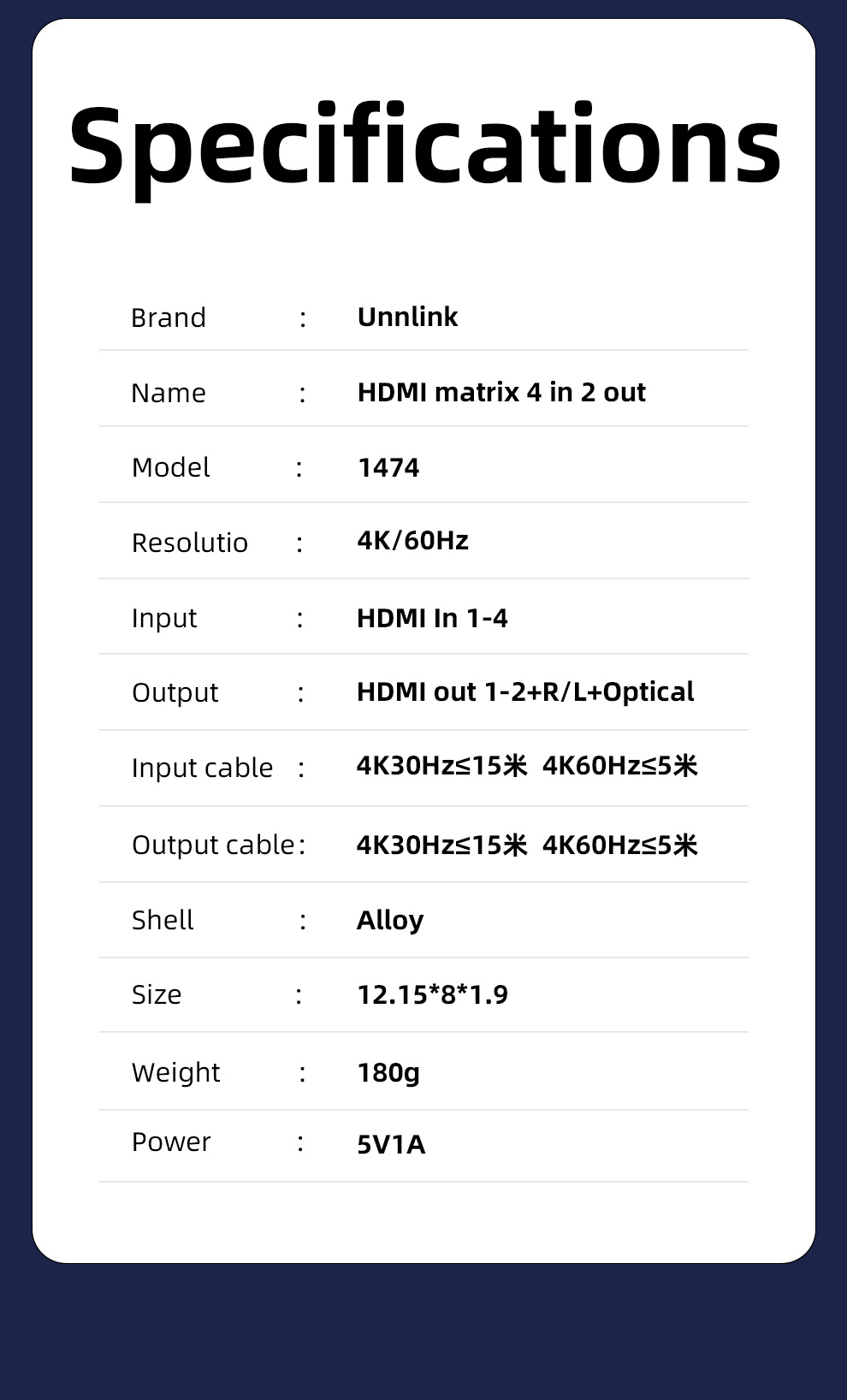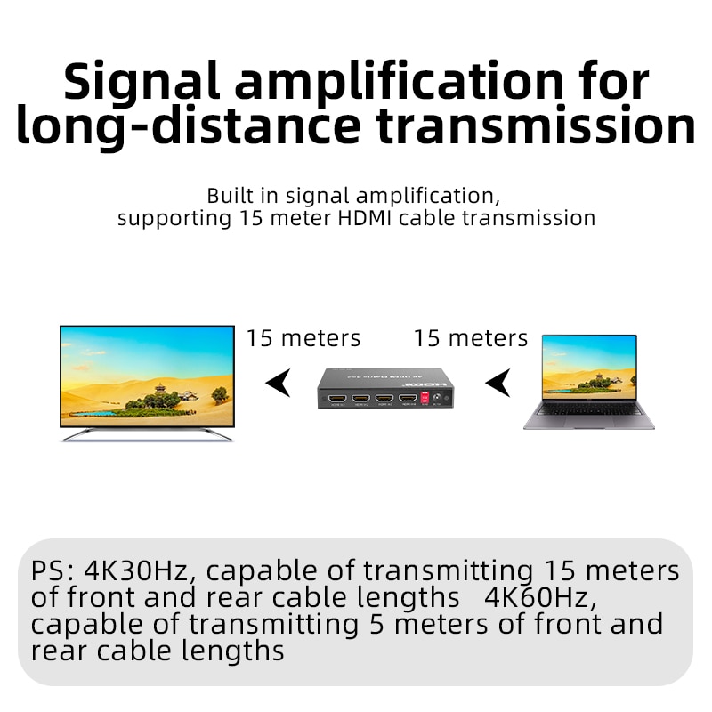 Расстояние выходного кабеля: 4K/30 Гц ≤ 15 м AWG26 Стандартный кабель HDMI, 4K/60 Гц ≤ 5 м Стандартный кабель HDMI 2,0