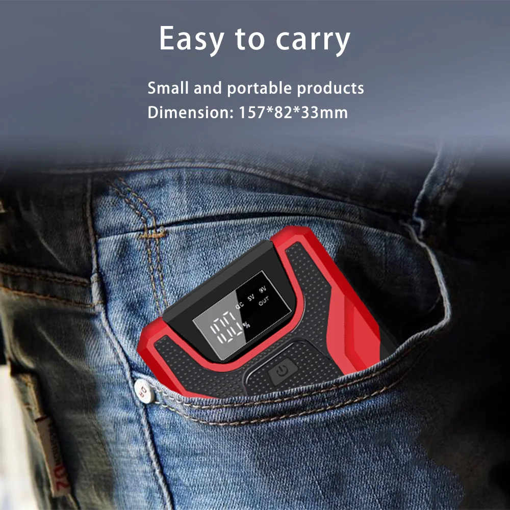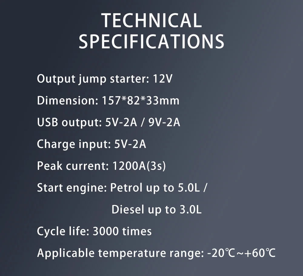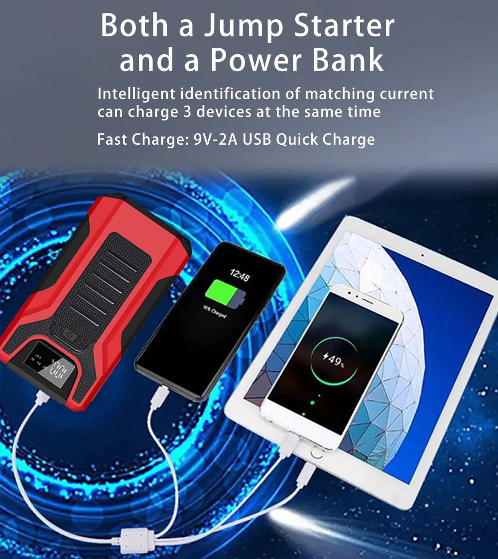 Quick starting 12V gasoline car (up to 5.0L) and diesel car (up to .L) just in seconds when the car battery dead. When you are travelling in some untraversed place, and your car battery is out of power, you can use this car jump starter to start your car.