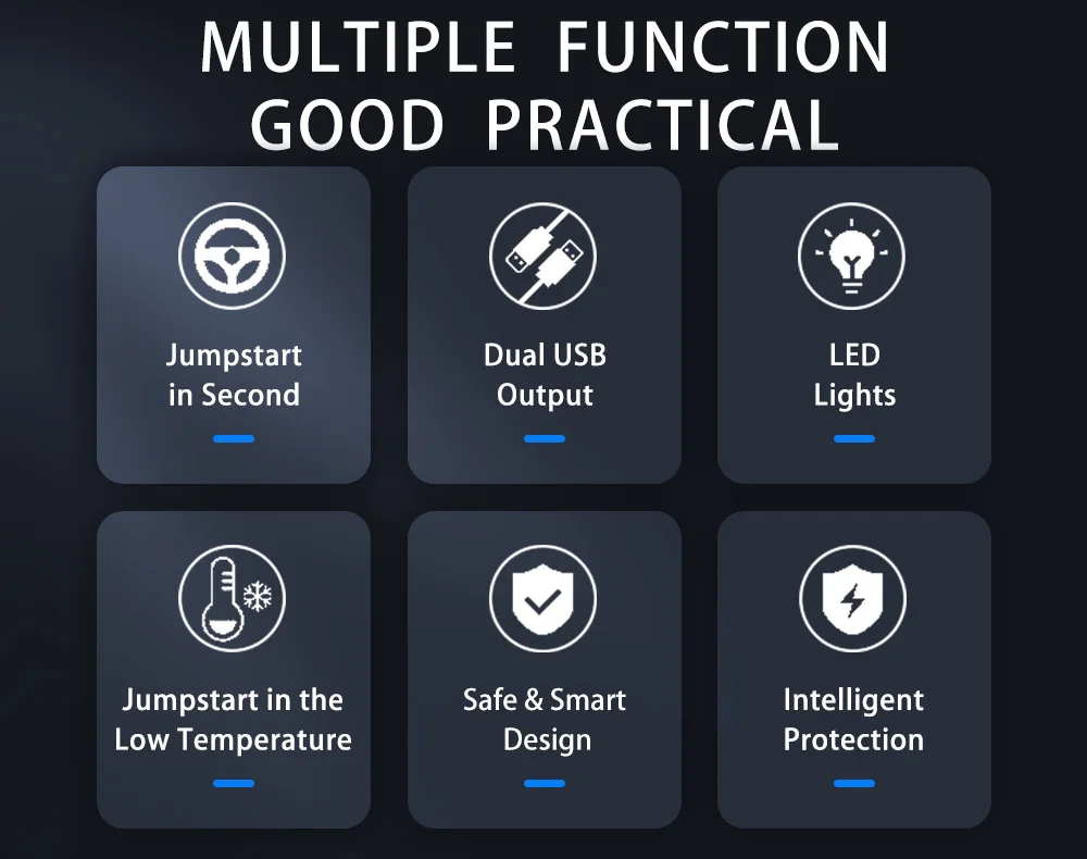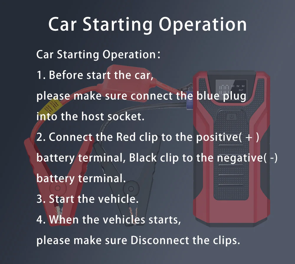 2.Please make sure that the jump starter is Fully Charged before starting the engine.