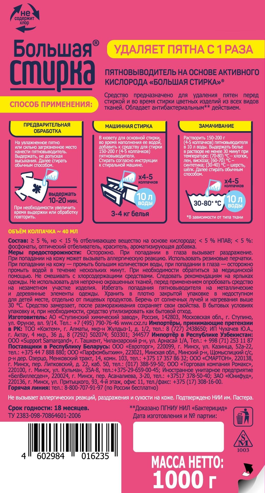 Пятновыводитель БОЛЬШАЯ СТИРКА на основе активного кислорода, 1000 г