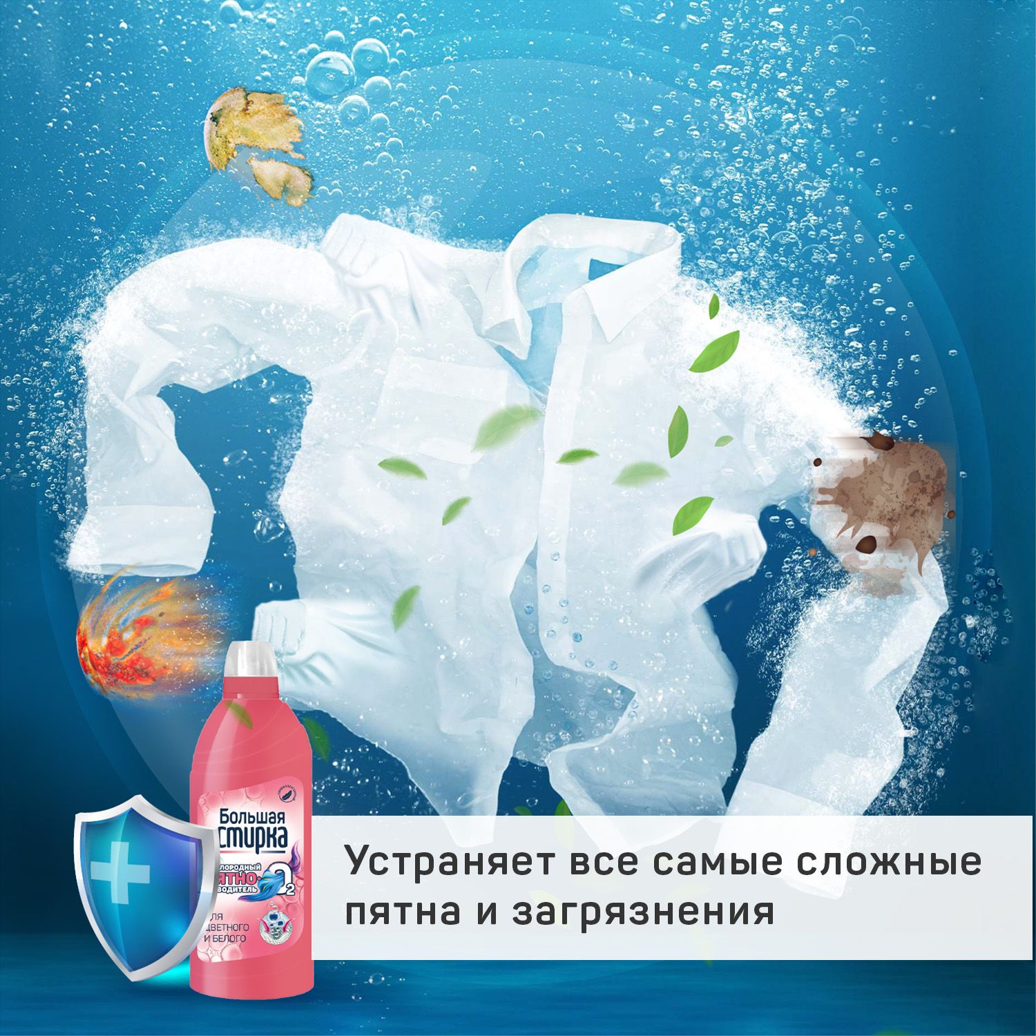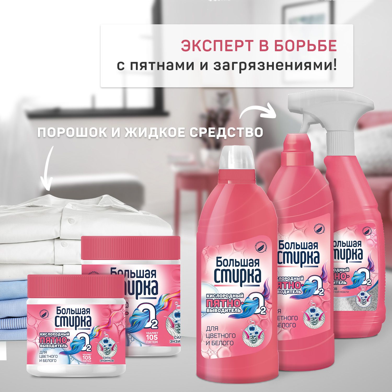 Справляется с различными загрязнениями.Просто добавьте к обычному средству.Большая стирка - бренд-специалист в тканях!