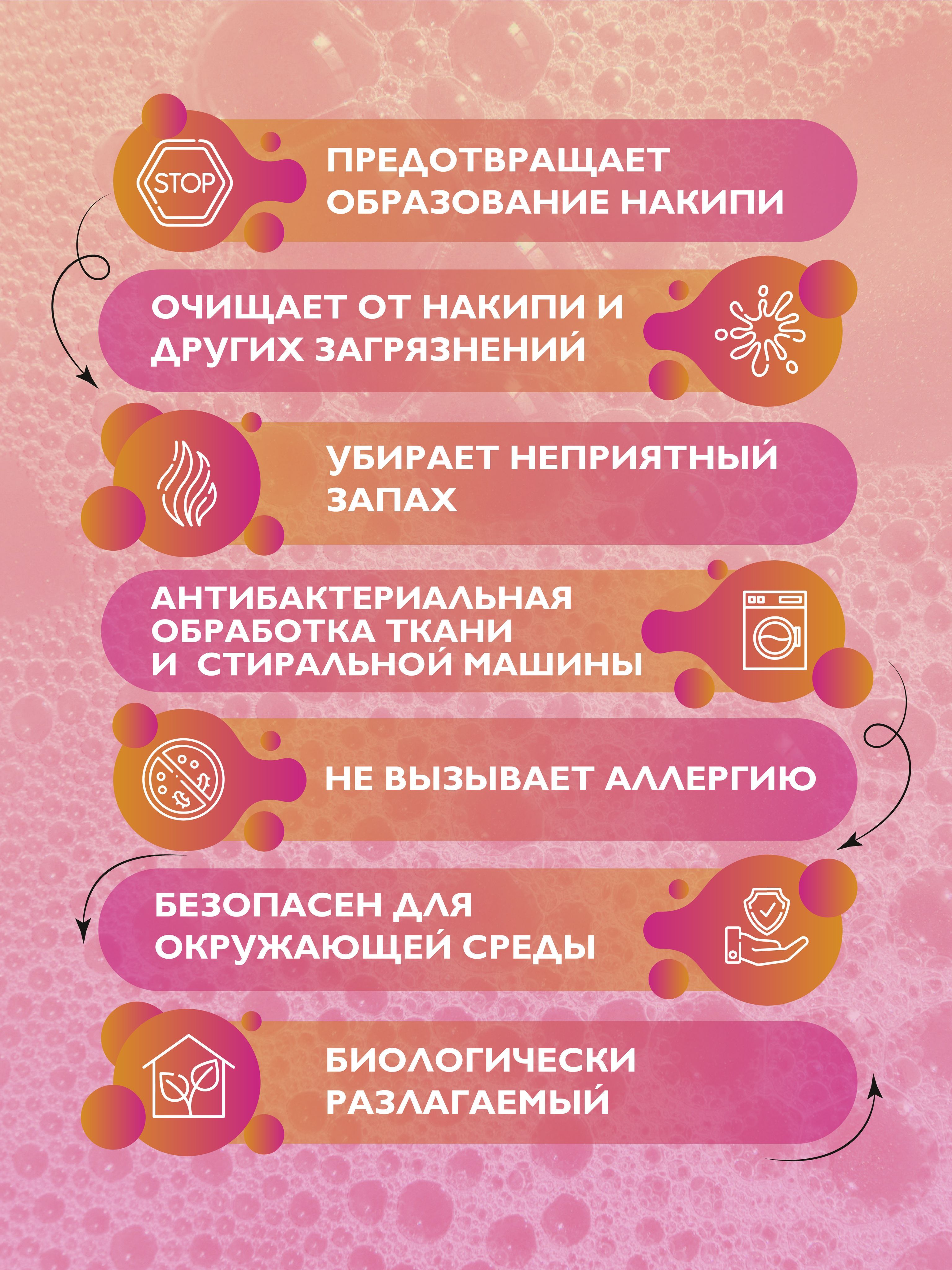 ✨ Предотвращает образование накипи, неприятного запаха, производит антибактериальную обработку как самих тканей, так и стиральной машины.