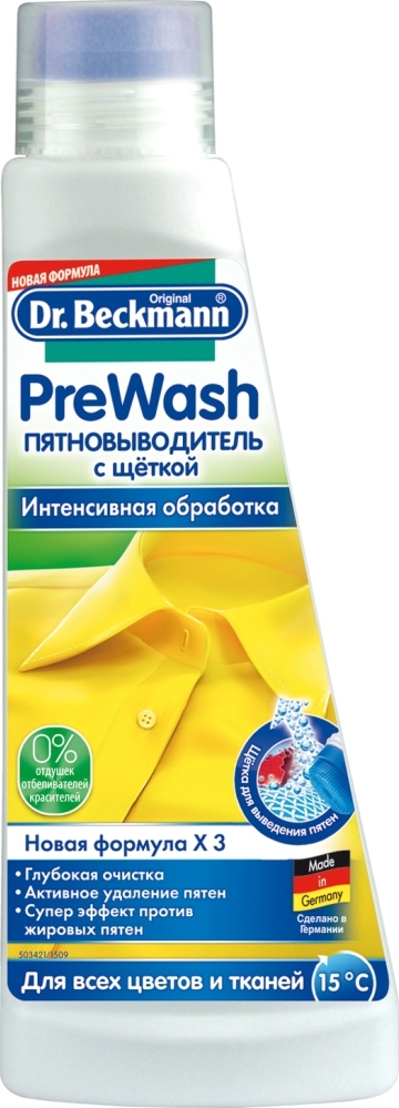 Описание: Благодаря эффективной формуле на основе уникальных энзимов, полностью разлагаемых в почве, средство "Dr. Beckmann" удаляет пятна на жировой основе, а также: пятна крови, молока, фруктов, кетчупа, детского питания и многого другого. Выводит застарелые и въевшиеся пятна на воротниках и манжетах с помощью специальной щетки. Средство работает даже при низких температурах.